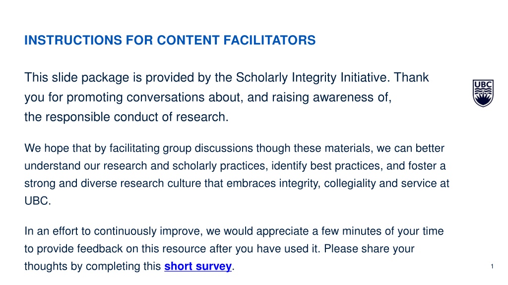 INSTRUCTIONS FOR CONTENT FACILITATORS This slide package is provided by the Scholarly Integrity Initiative. Thank you for promoting conversations about, and raising awareness of, the responsible conduct of research. We hope that by facilitating group discussions though these materials, we can better understand our research and scholarly practices, identify best practices, and foster a strong and diverse research culture that embraces integrity, collegiality and service at UBC. In an effort to continuously improve, we would appreciate a few minutes of your time to provide feedback on this resource after you have used it. Please share your thoughts by completing this short survey. 1