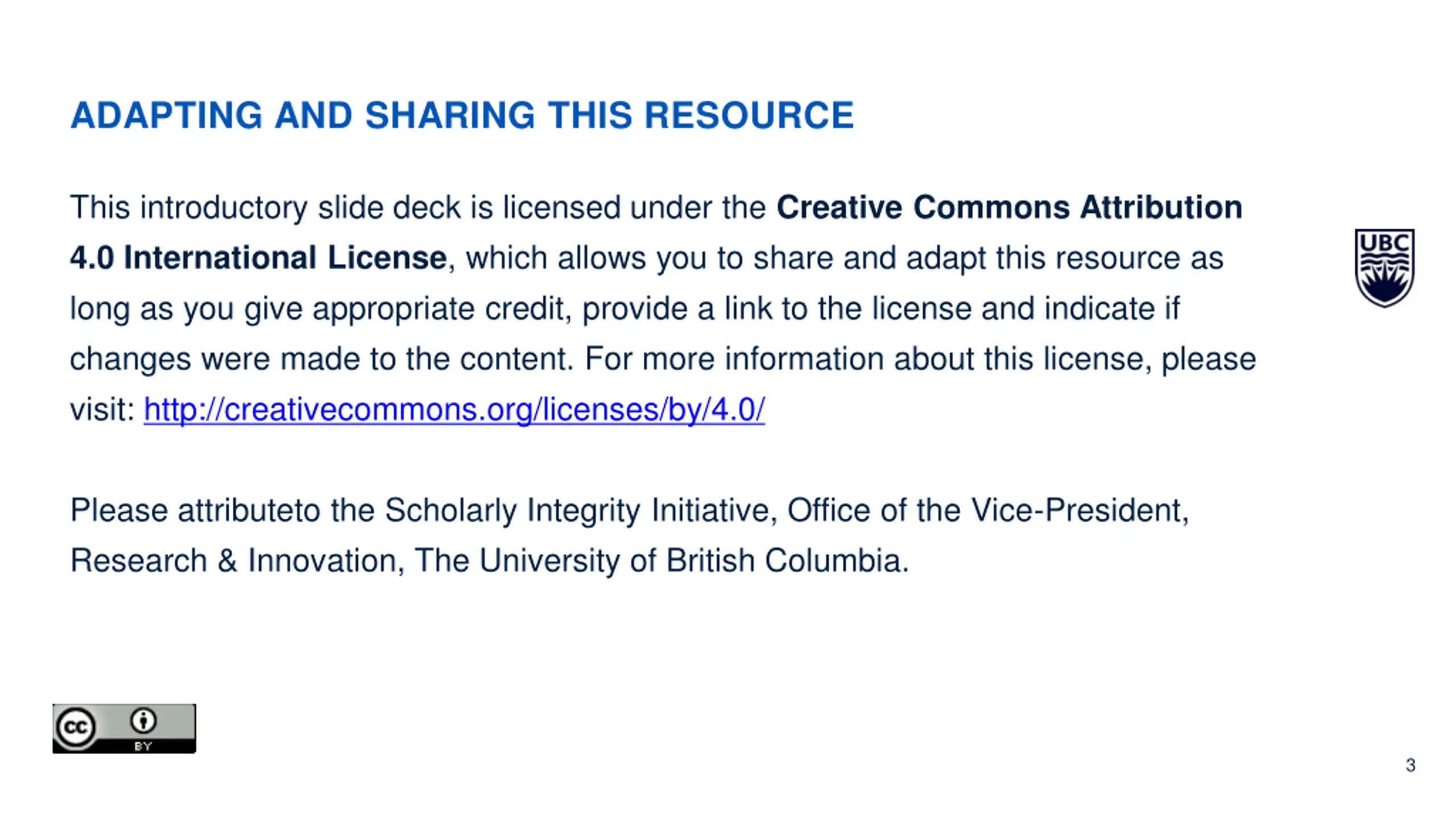 ADAPTING AND SHARING THIS RESOURCE This introductory slide deck is licensed under the Creative Commons Attribution 4.0 International License, which allows you to share and adapt this resource as long as you give appropriate credit, provide a link to the license and indicate if changes were made to the content. For more information about this license, please visit: http://creativecommons.org/licenses/by/4.0/ Please attributeto the Scholarly Integrity Initiative, Office of the Vice-President, Research & Innovation, The University of British Columbia. 3
