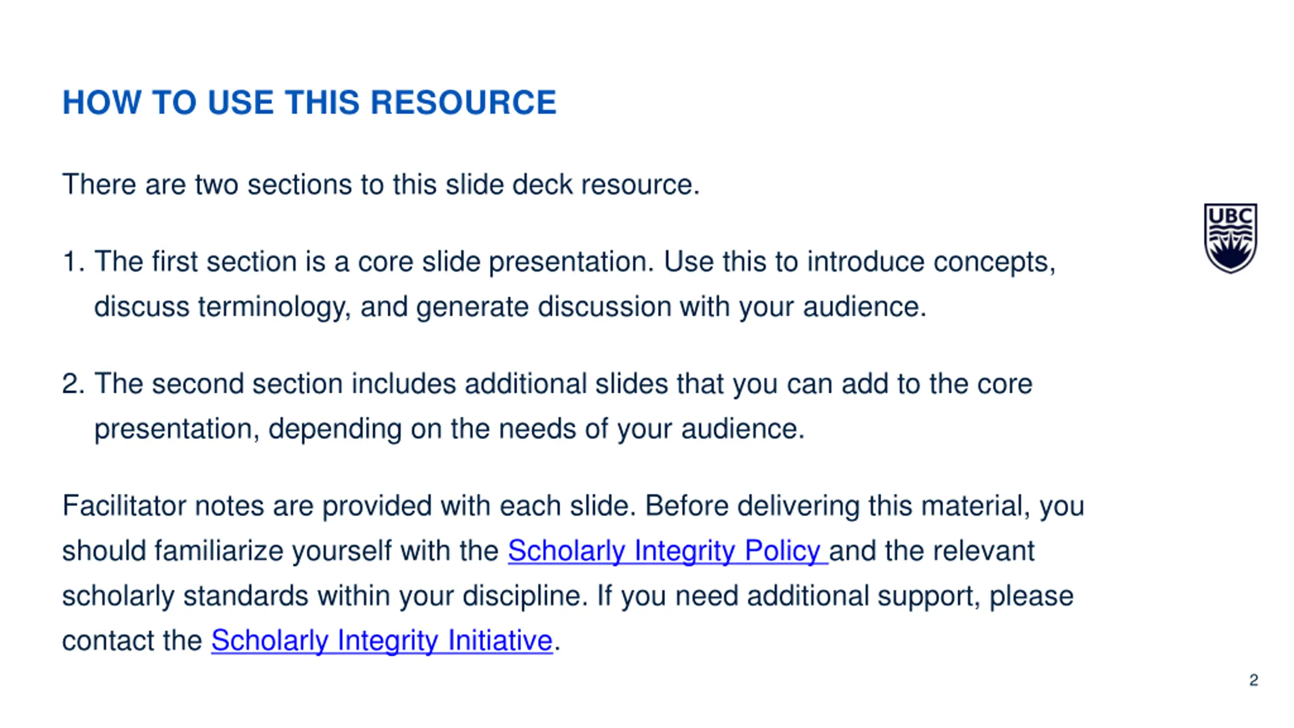 HOW TO USE THIS RESOURCE There are two sections to this slide deck resource. 1. The first section is a core slide presentation. Use this to introduce concepts, discuss terminology, and generate discussion with your audience. 2. The second section includes additional slides that you can add to the core presentation, depending on the needs of your audience. Facilitator notes are provided with each slide. Before delivering this material, you should familiarize yourself with the Scholarly Integrity Policy and the relevant scholarly standards within your discipline. If you need additional support, please contact the Scholarly Integrity Initiative. 2
