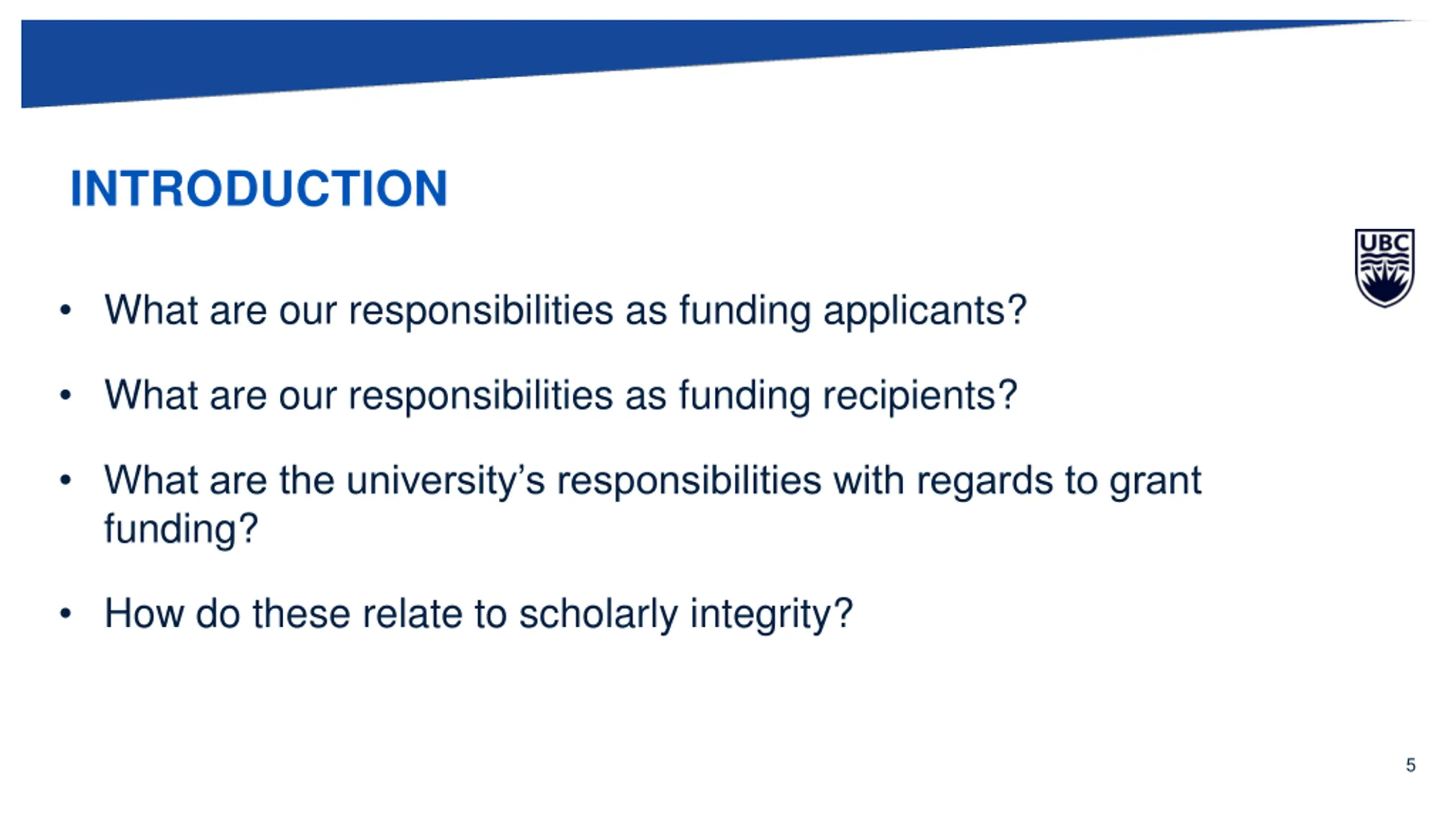INTRODUCTION What are our responsibilities as funding applicants? What are our responsibilities as funding recipients? What are the university s responsibilities with regards to grant funding? How do these relate to scholarly integrity? 5