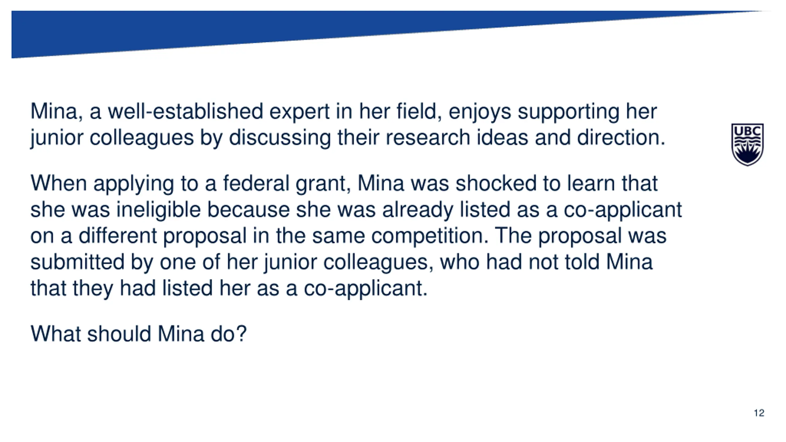 Mina, a well-established expert in her field, enjoys supporting her junior colleagues by discussing their research ideas and direction. When applying to a federal grant, Mina was shocked to learn that she was ineligible because she was already listed as a co-applicant on a different proposal in the same competition. The proposal was submitted by one of her junior colleagues, who had not told Mina that they had listed her as a co-applicant. What should Mina do? 12