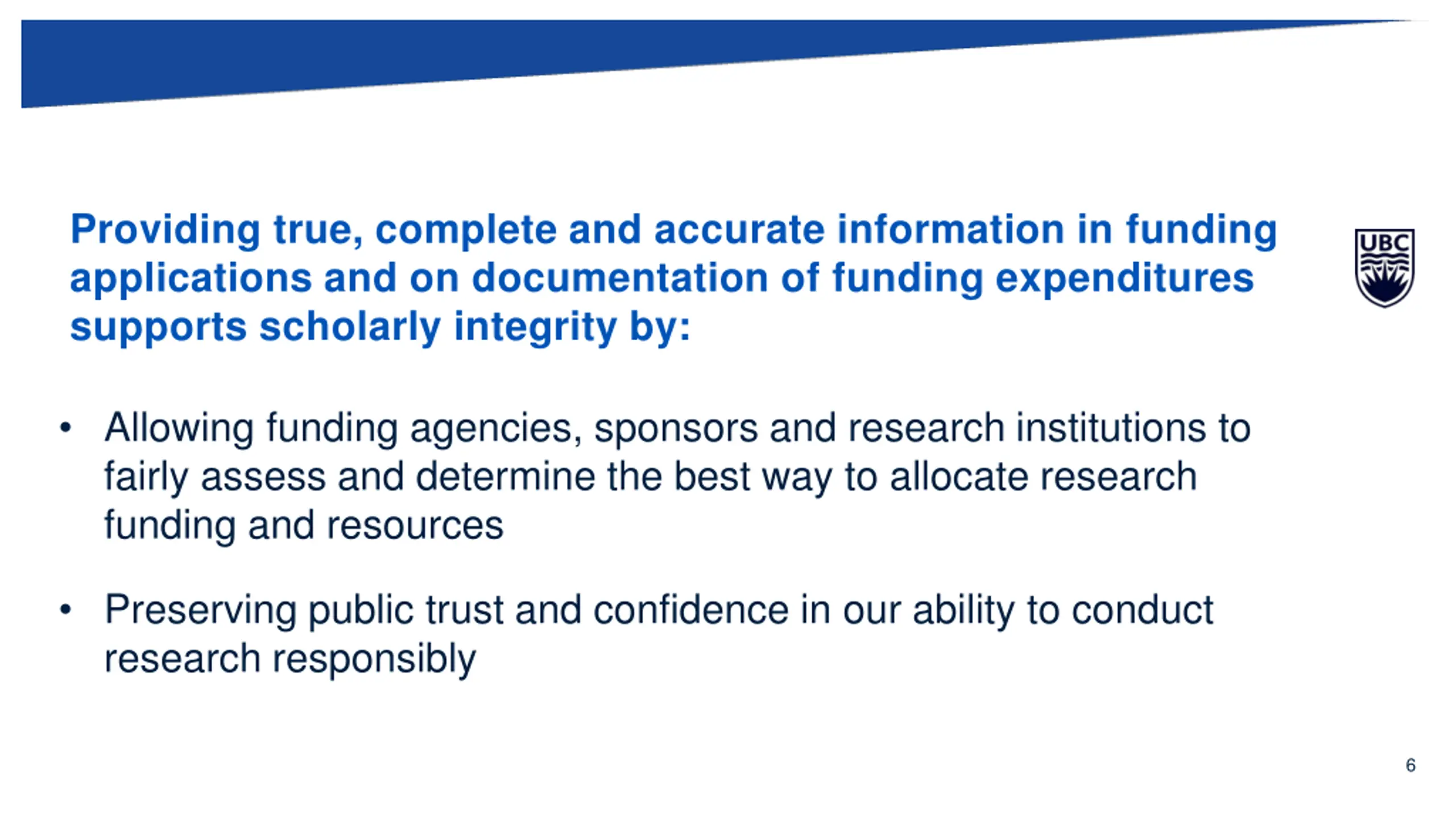 Providing true, complete and accurate information in funding applications and on documentation of funding expenditures supports scholarly integrity by: Allowing funding agencies, sponsors and research institutions to fairly assess and determine the best way to allocate research funding and resources Preserving public trust and confidence in our ability to conduct research responsibly 6