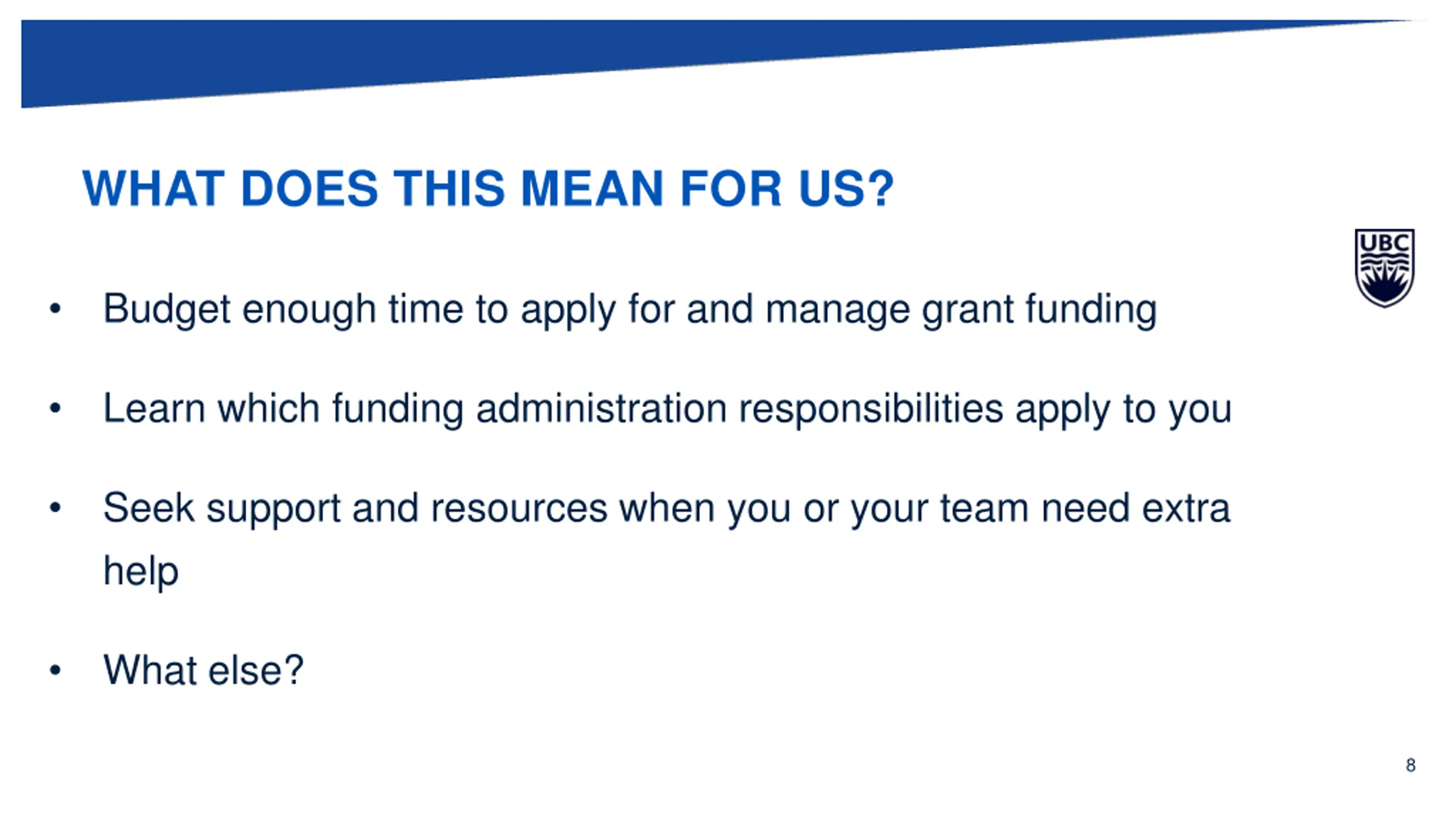 WHAT DOES THIS MEAN FOR US? Budget enough time to apply for and manage grant funding Learn which funding administration responsibilities apply to you Seek support and resources when you or your team need extra help What else? 8