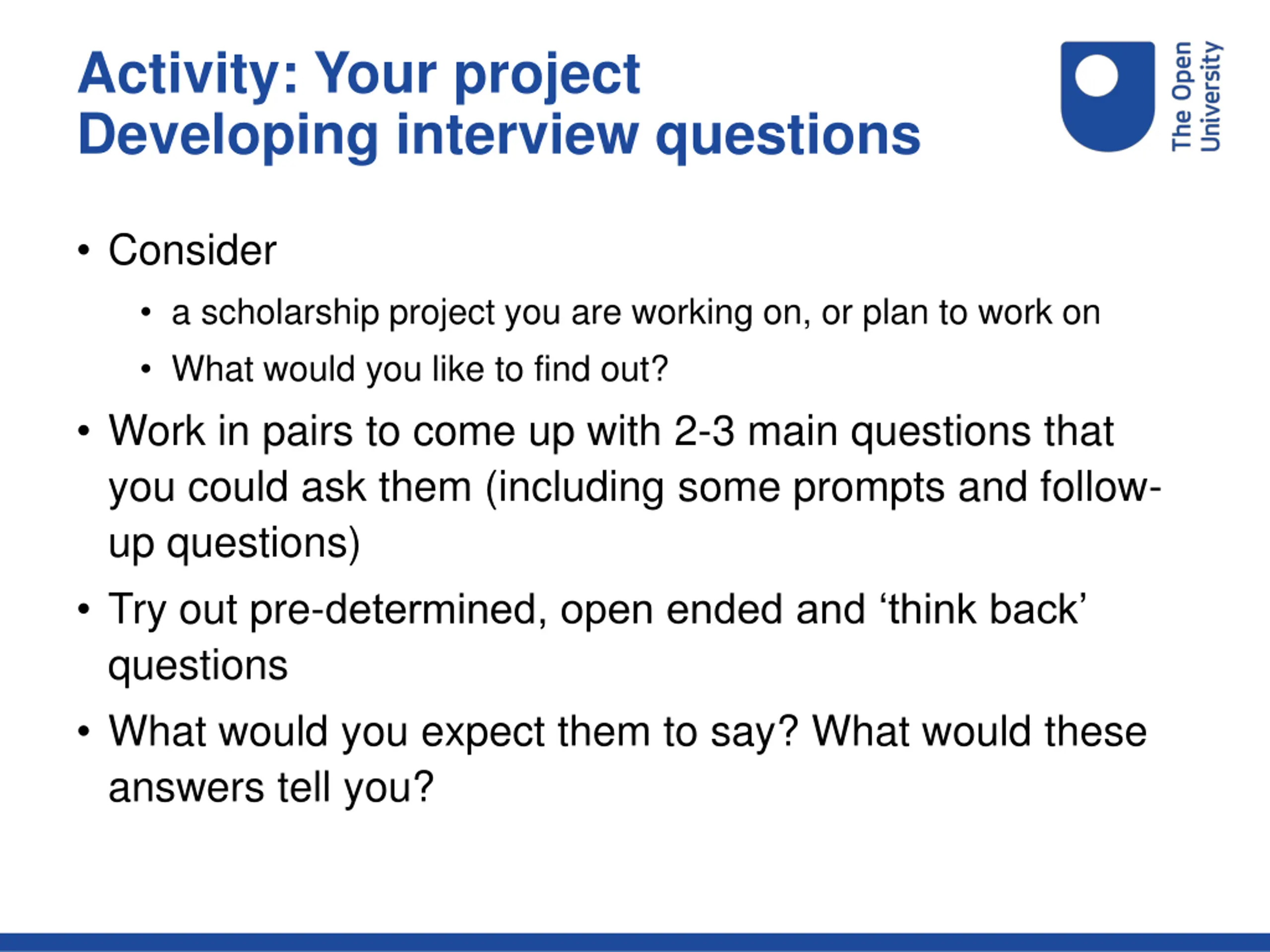 Activity: Your project Developing interview questions Consider a scholarship project you are working on, or plan to work on What would you like to find out? Work in pairs to come up with 2-3 main questions that you could ask them (including some prompts and follow- up questions) Try out pre-determined, open ended and think back questions What would you expect them to say? What would these answers tell you?