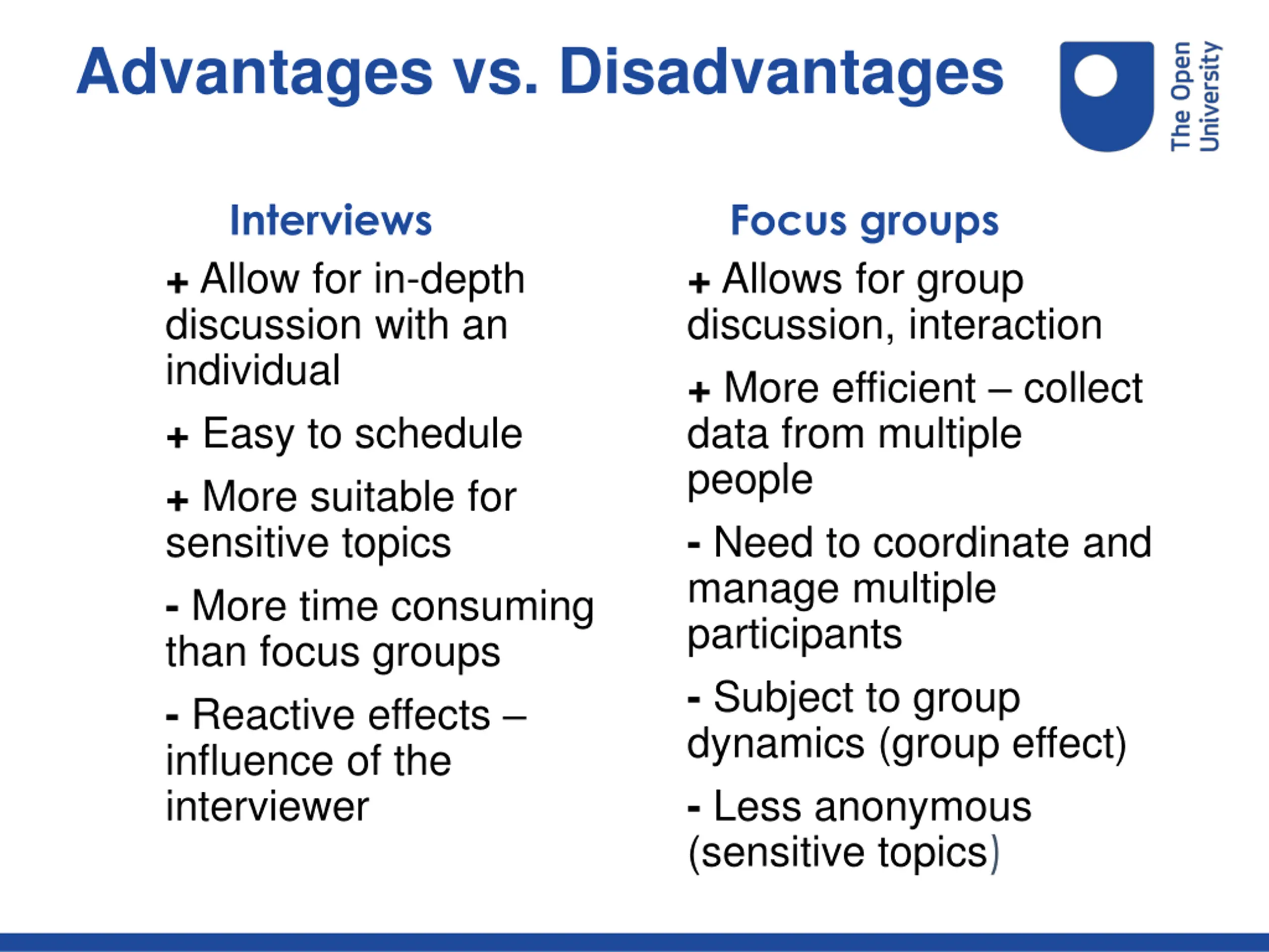 Advantages vs. Disadvantages Focus groups + Allows for group discussion, interaction + More efficient collect data from multiple people - Need to coordinate and manage multiple participants - Subject to group dynamics (group effect) - Less anonymous (sensitive topics) Interviews + Allow for in-depth discussion with an individual + Easy to schedule + More suitable for sensitive topics - More time consuming than focus groups - Reactive effects influence of the interviewer