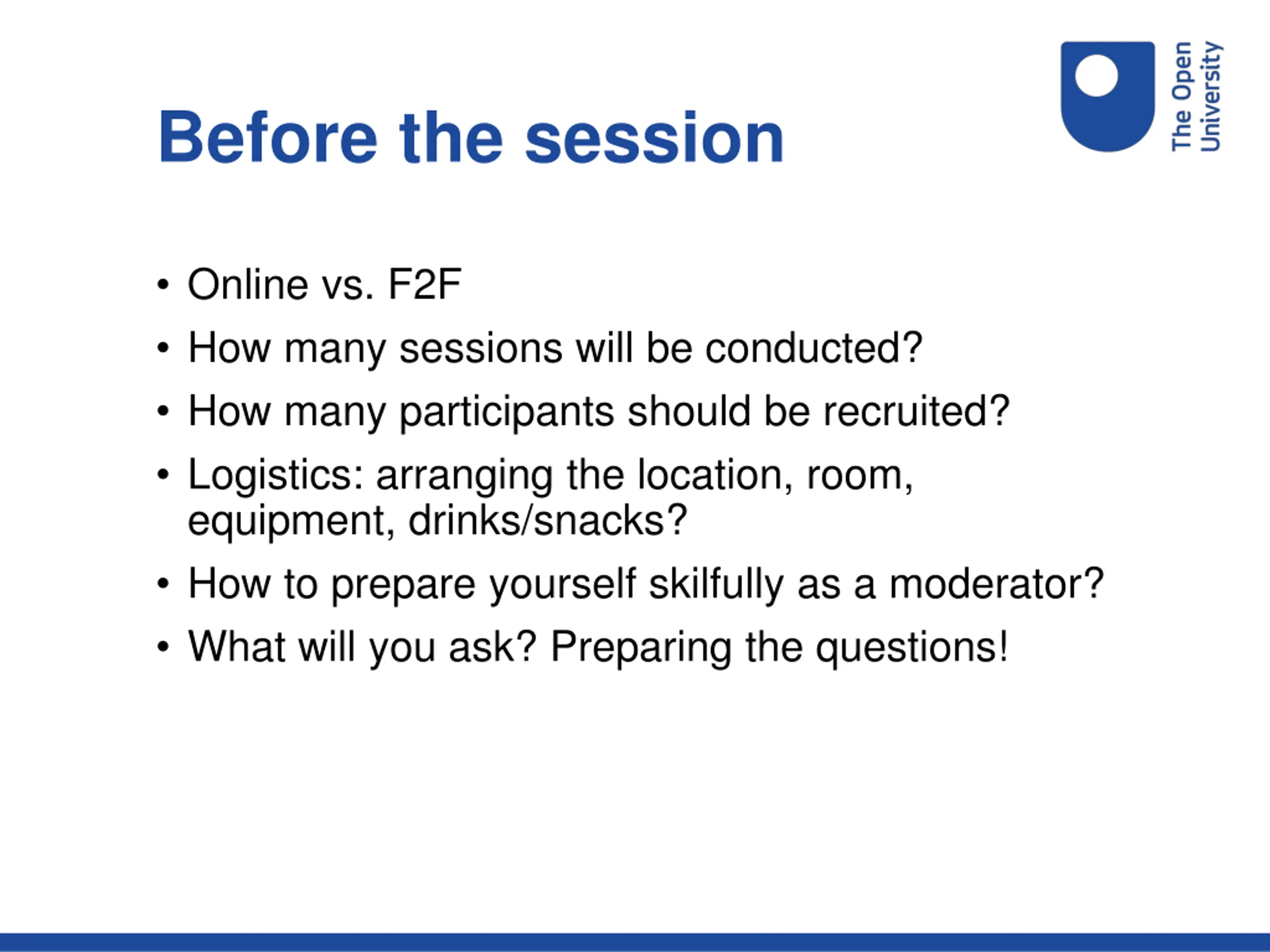 Before the session Online vs. F2F How many sessions will be conducted? How many participants should be recruited? Logistics: arranging the location, room, equipment, drinks/snacks? How to prepare yourself skilfully as a moderator? What will you ask? Preparing the questions!