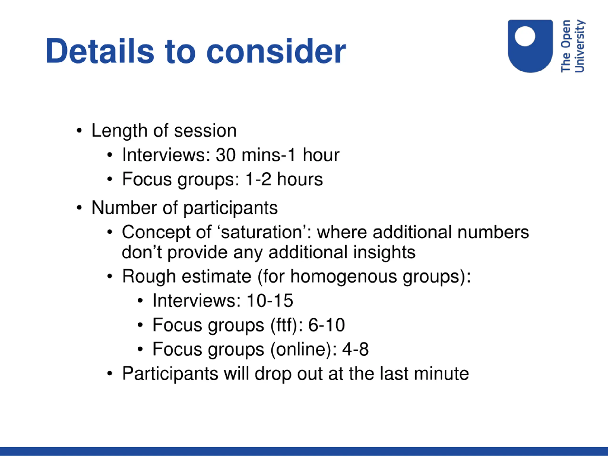 Details to consider Length of session Interviews: 30 mins-1 hour Focus groups: 1-2 hours Number of participants Concept of saturation : where additional numbers don t provide any additional insights Rough estimate (for homogenous groups): Interviews: 10-15 Focus groups (ftf): 6-10 Focus groups (online): 4-8 Participants will drop out at the last minute