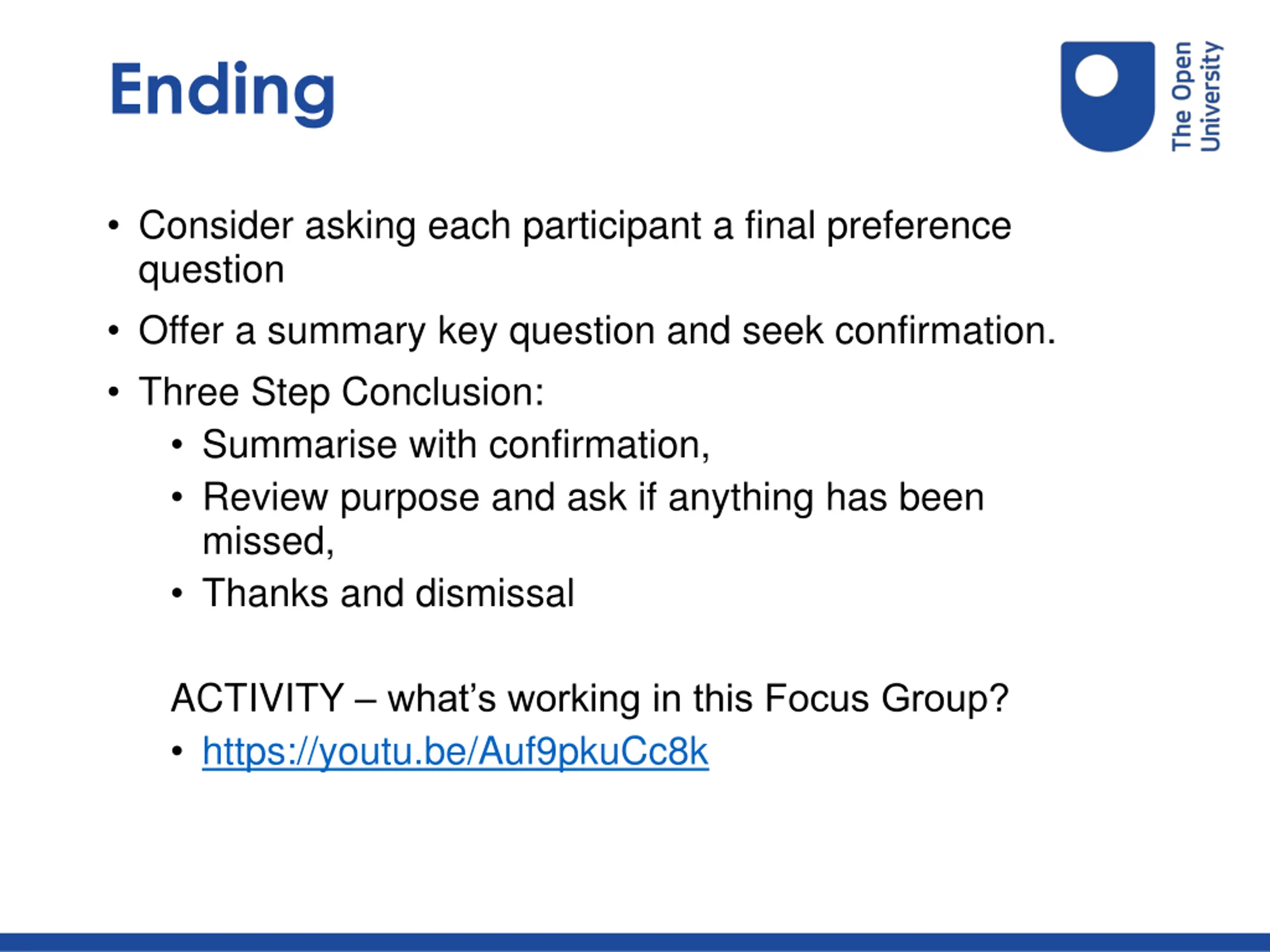 Ending Consider asking each participant a final preference question Offer a summary key question and seek confirmation. Three Step Conclusion: Summarise with confirmation, Review purpose and ask if anything has been missed, Thanks and dismissal ACTIVITY what s working in this Focus Group? https://youtu.be/Auf9pkuCc8k