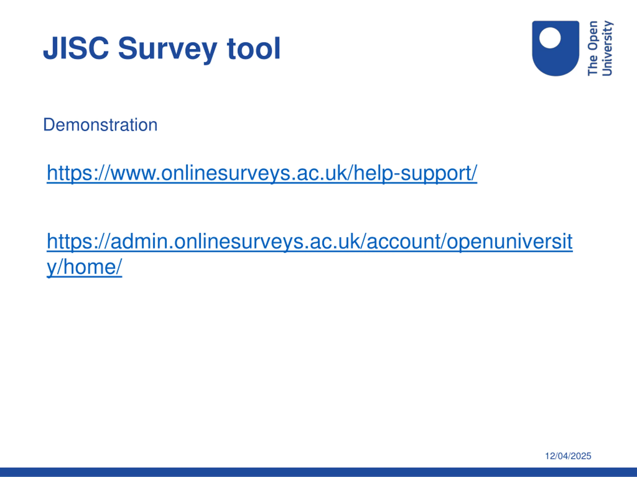 JISC Survey tool Demonstration https://www.onlinesurveys.ac.uk/help-support/ https://admin.onlinesurveys.ac.uk/account/openuniversit y/home/ 12/04/2025