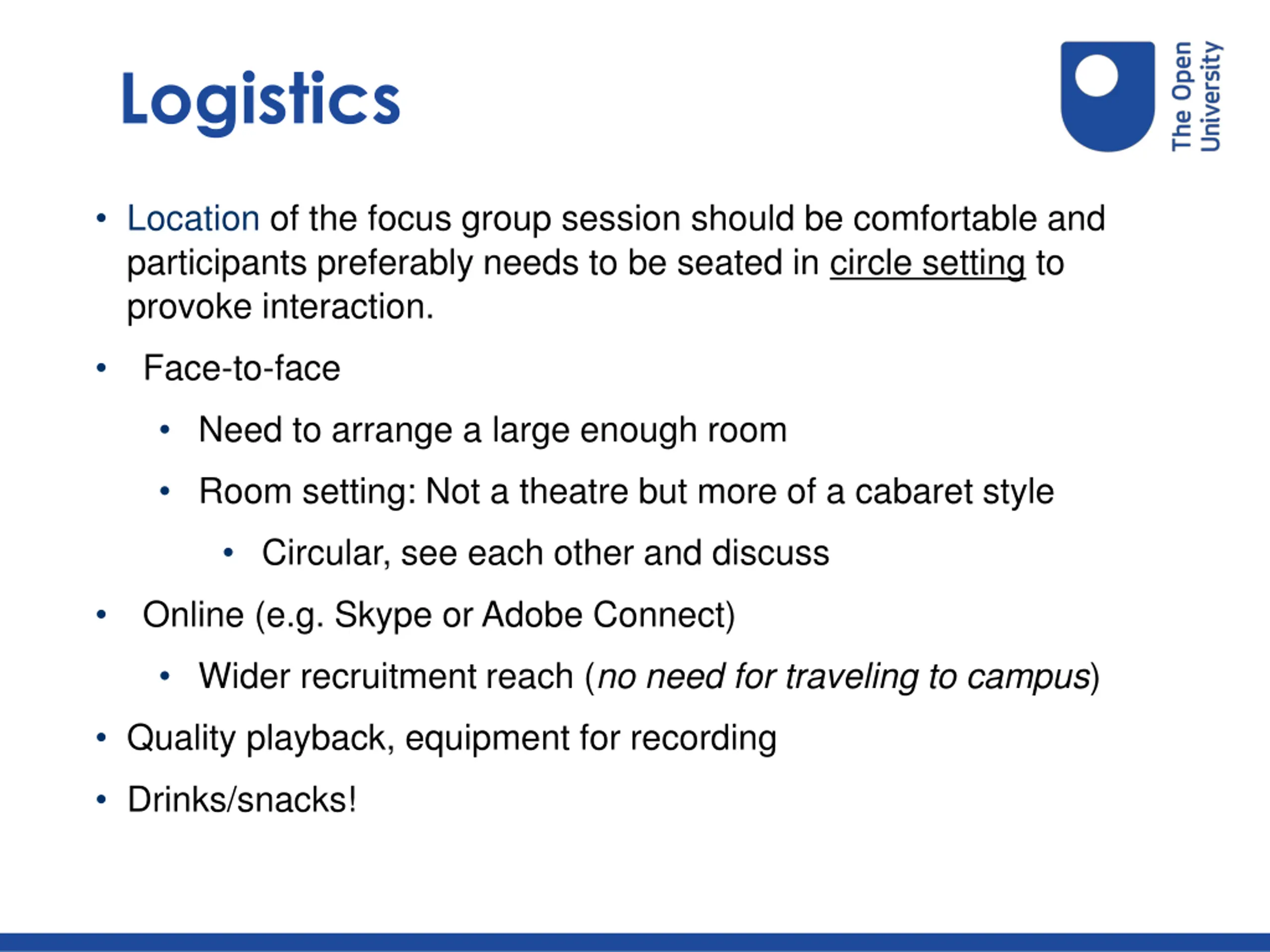 Logistics Location of the focus group session should be comfortable and participants preferably needs to be seated in circle setting to provoke interaction. Face-to-face Need to arrange a large enough room Room setting: Not a theatre but more of a cabaret style Circular, see each other and discuss Online (e.g. Skype or Adobe Connect) Wider recruitment reach (no need for traveling to campus) Quality playback, equipment for recording Drinks/snacks!
