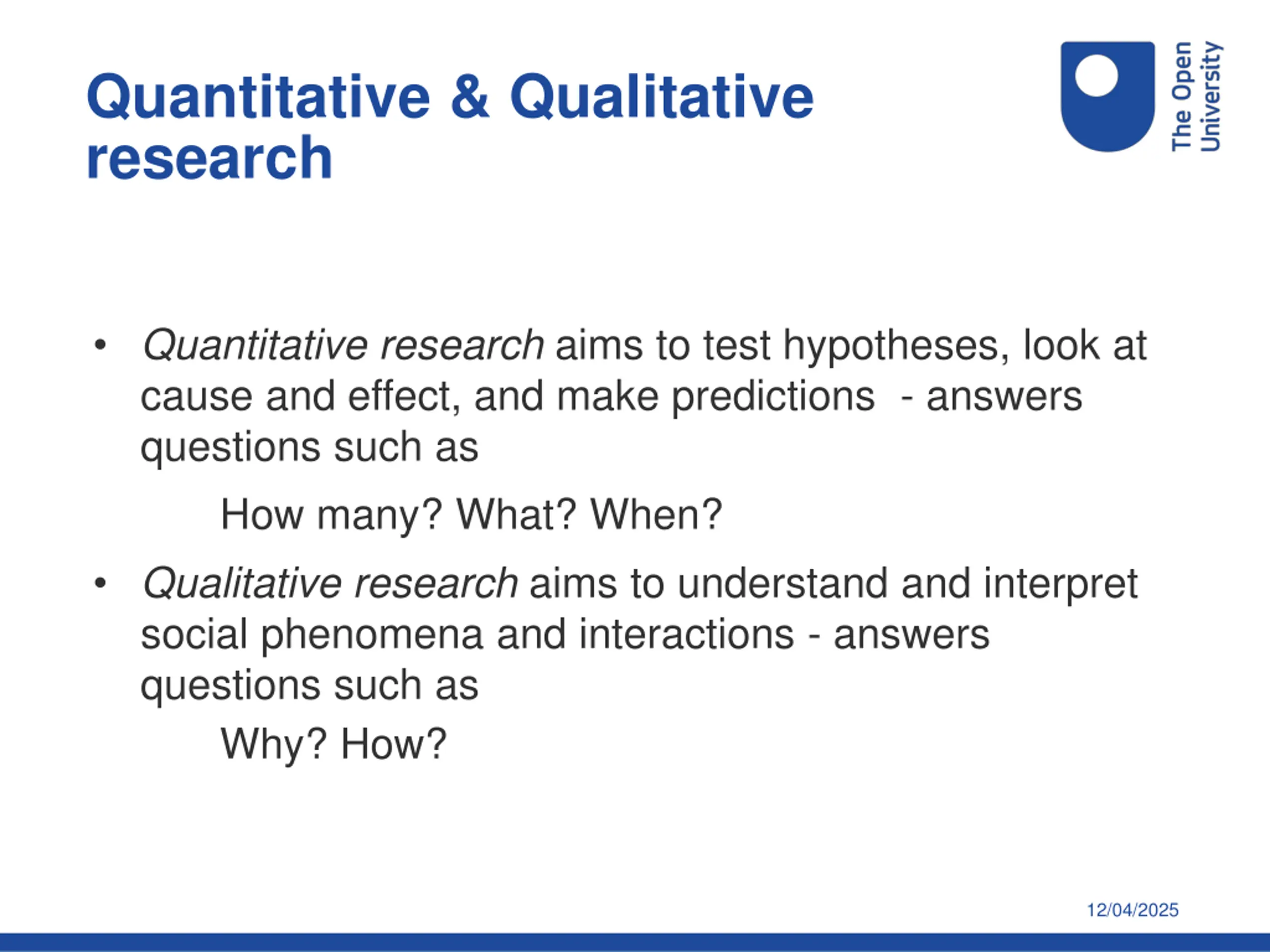 Quantitative & Qualitative research Quantitative research aims to test hypotheses, look at cause and effect, and make predictions - answers questions such as How many? What? When? Qualitative research aims to understand and interpret social phenomena and interactions - answers questions such as Why? How? 12/04/2025