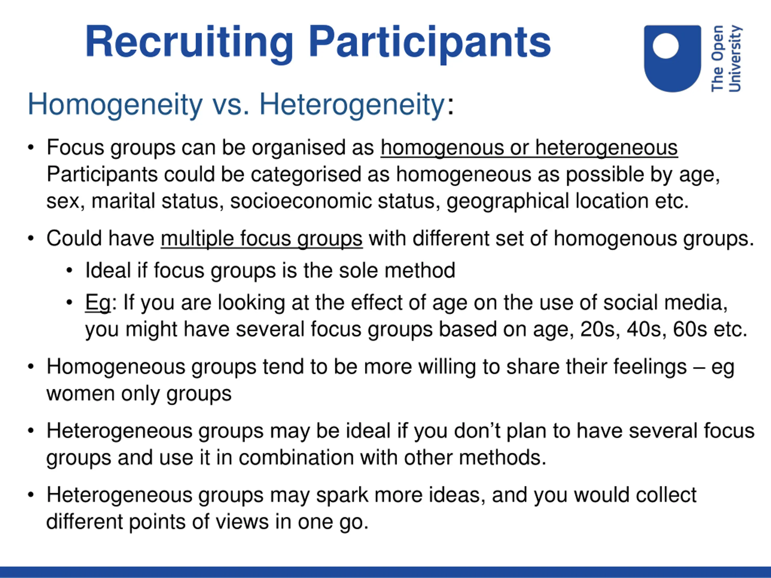 Recruiting Participants Homogeneity vs. Heterogeneity: Focus groups can be organised as homogenous or heterogeneous Participants could be categorised as homogeneous as possible by age, sex, marital status, socioeconomic status, geographical location etc. Could have multiple focus groups with different set of homogenous groups. Ideal if focus groups is the sole method Eg: If you are looking at the effect of age on the use of social media, you might have several focus groups based on age, 20s, 40s, 60s etc. Homogeneous groups tend to be more willing to share their feelings eg women only groups Heterogeneous groups may be ideal if you don t plan to have several focus groups and use it in combination with other methods. Heterogeneous groups may spark more ideas, and you would collect different points of views in one go.