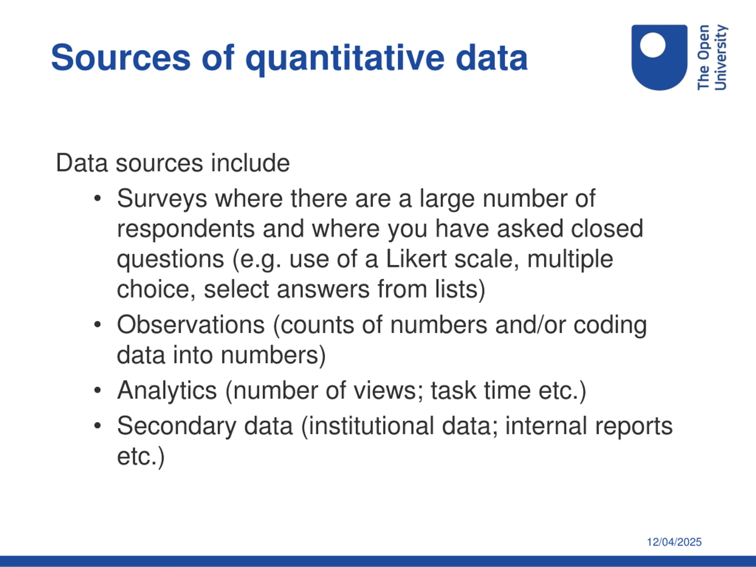 Sources of quantitative data Data sources include Surveys where there are a large number of respondents and where you have asked closed questions (e.g. use of a Likert scale, multiple choice, select answers from lists) Observations (counts of numbers and/or coding data into numbers) Analytics (number of views; task time etc.) Secondary data (institutional data; internal reports etc.) 12/04/2025