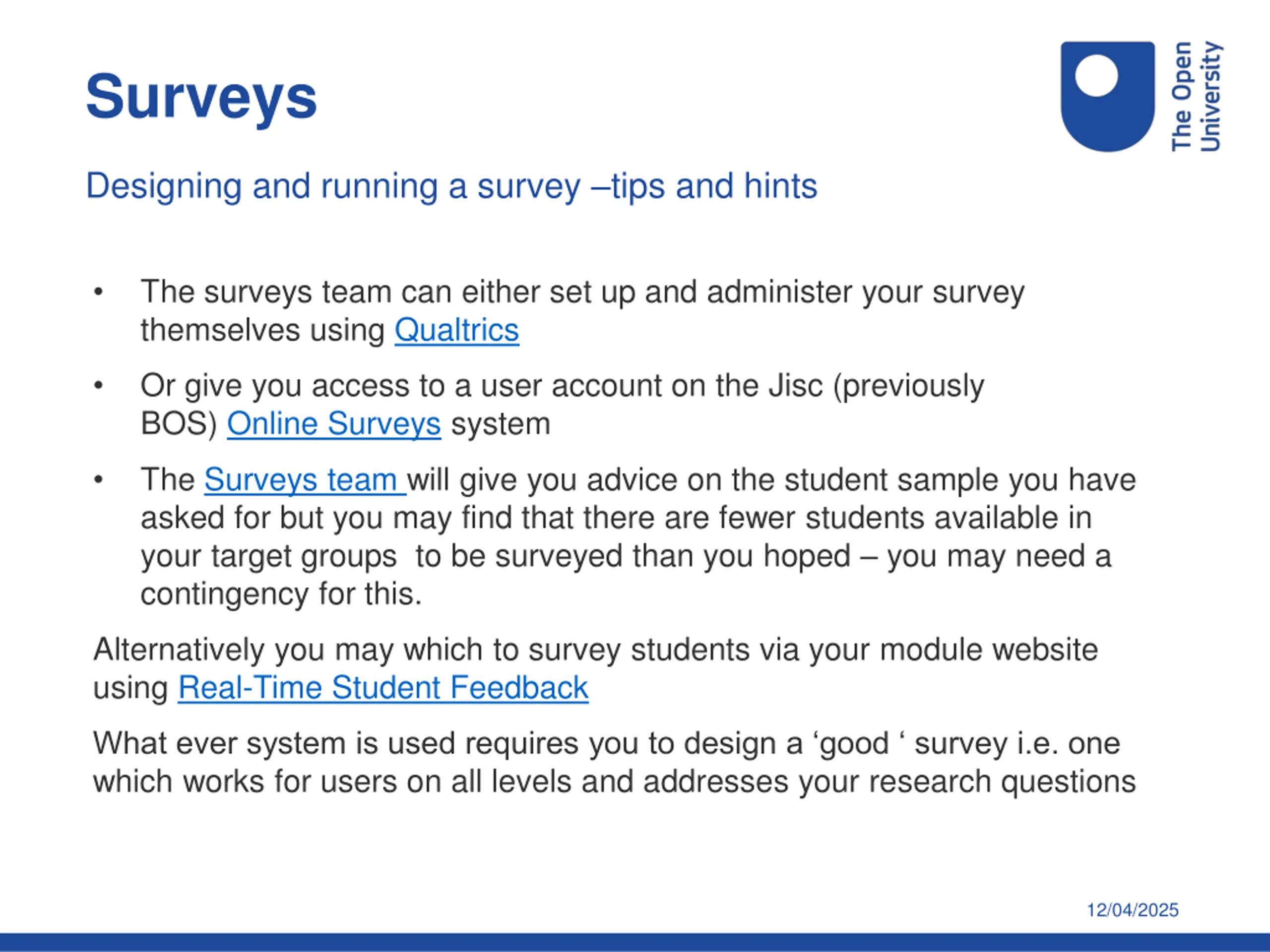 Surveys Designing and running a survey tips and hints (cont.) Think about Invitations and reminders How long your survey will be open for Timing your survey around module activities Asking for student demographic data and making it accessible in your survey tool Length of survey no of questions Conditionality of routing through your questions Balance of question types closed and open Types of closed question - variety while still retaining clarity! If you want to follow up respondents for interviews/focus groups ask for consent and emails addresses in your survey Getting your survey checked before it is released 12/04/2025