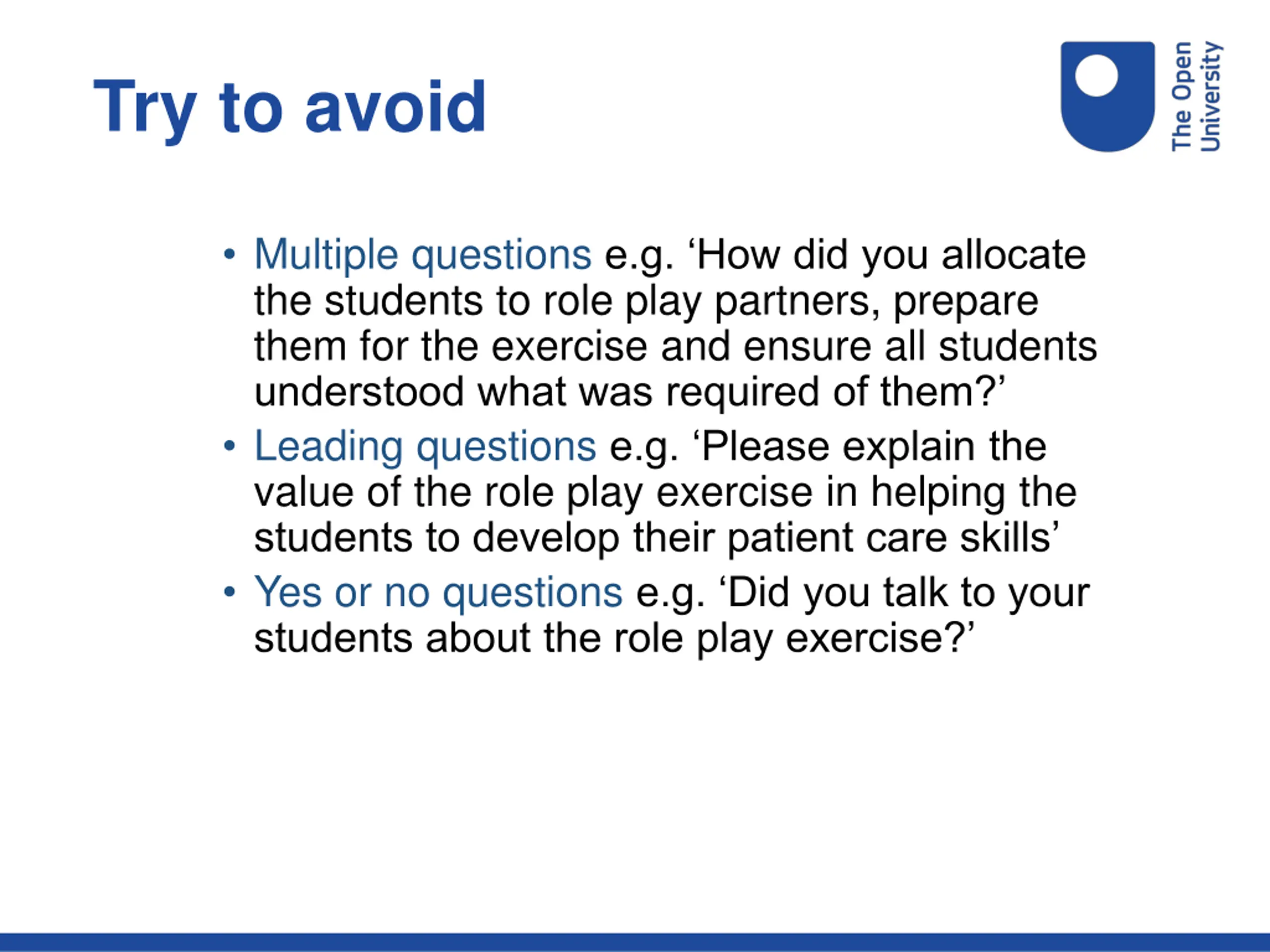 Try to avoid Multiple questions e.g. How did you allocate the students to role play partners, prepare them for the exercise and ensure all students understood what was required of them? Leading questions e.g. Please explain the value of the role play exercise in helping the students to develop their patient care skills Yes or no questions e.g. Did you talk to your students about the role play exercise?
