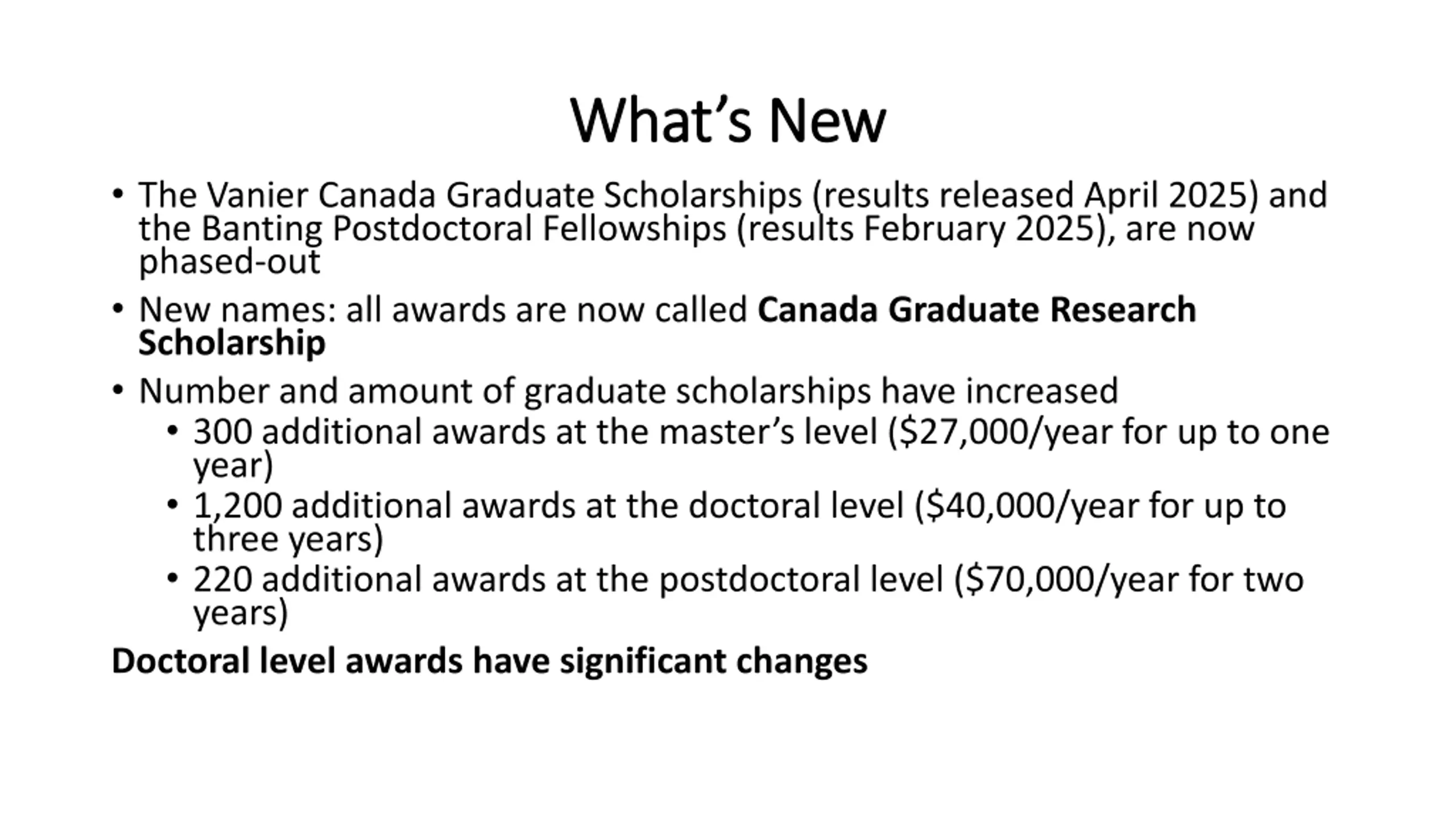 Whats New What s New The Vanier Canada Graduate Scholarships (results released April 2025) and the Banting Postdoctoral Fellowships (results February 2025), are now phased-out New names: all awards are now called Canada Graduate Research Scholarship Number and amount of graduate scholarships have increased 300 additional awards at the master s level ($27,000/year for up to one year) 1,200 additional awards at the doctoral level ($40,000/year for up to three years) 220 additional awards at the postdoctoral level ($70,000/year for two years) Doctoral level awards have significant changes