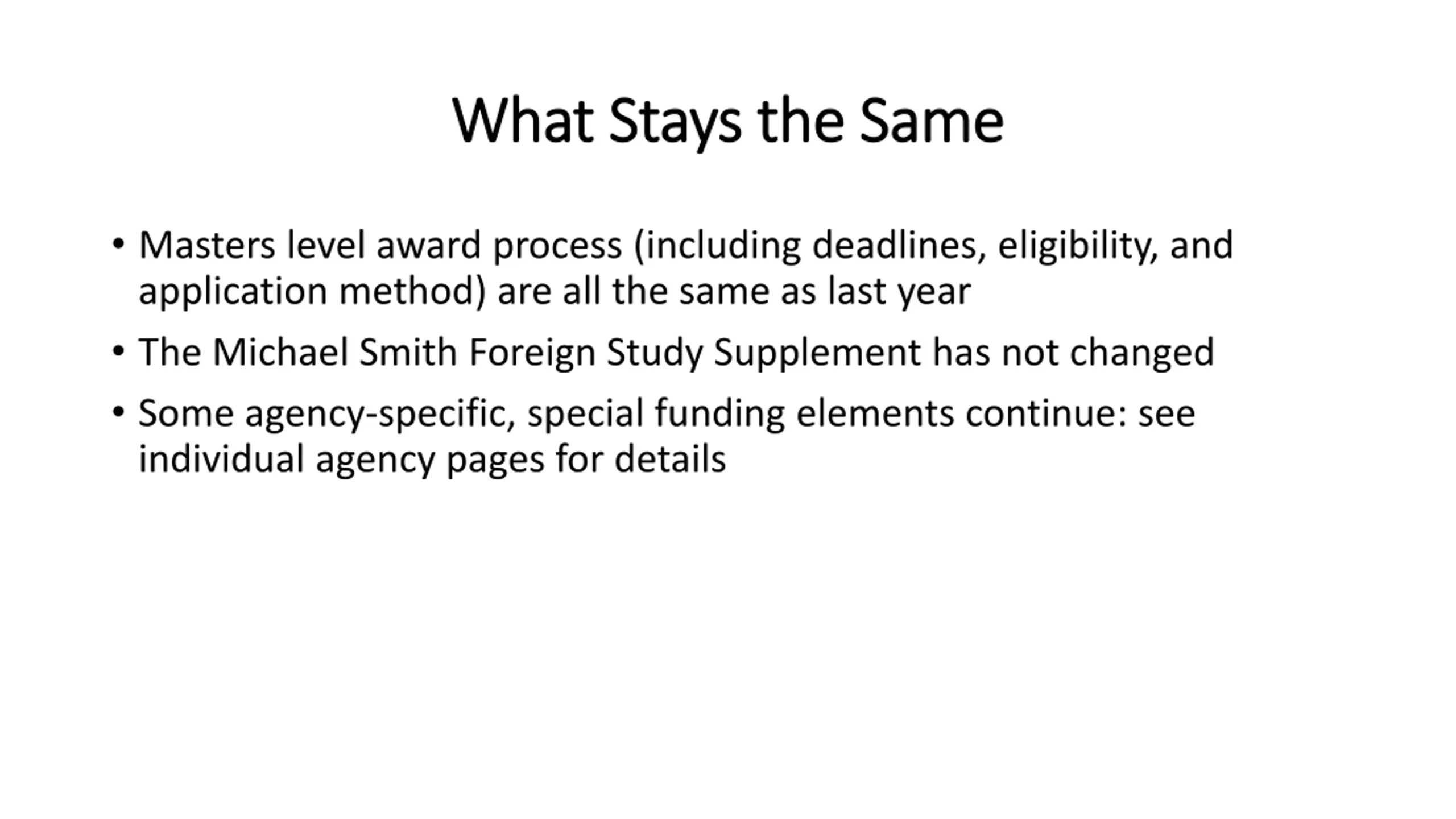 What Stays the Same What Stays the Same Masters level award process (including deadlines, eligibility, and application method) are all the same as last year The Michael Smith Foreign Study Supplement has not changed Some agency-specific, special funding elements continue: see individual agency pages for details