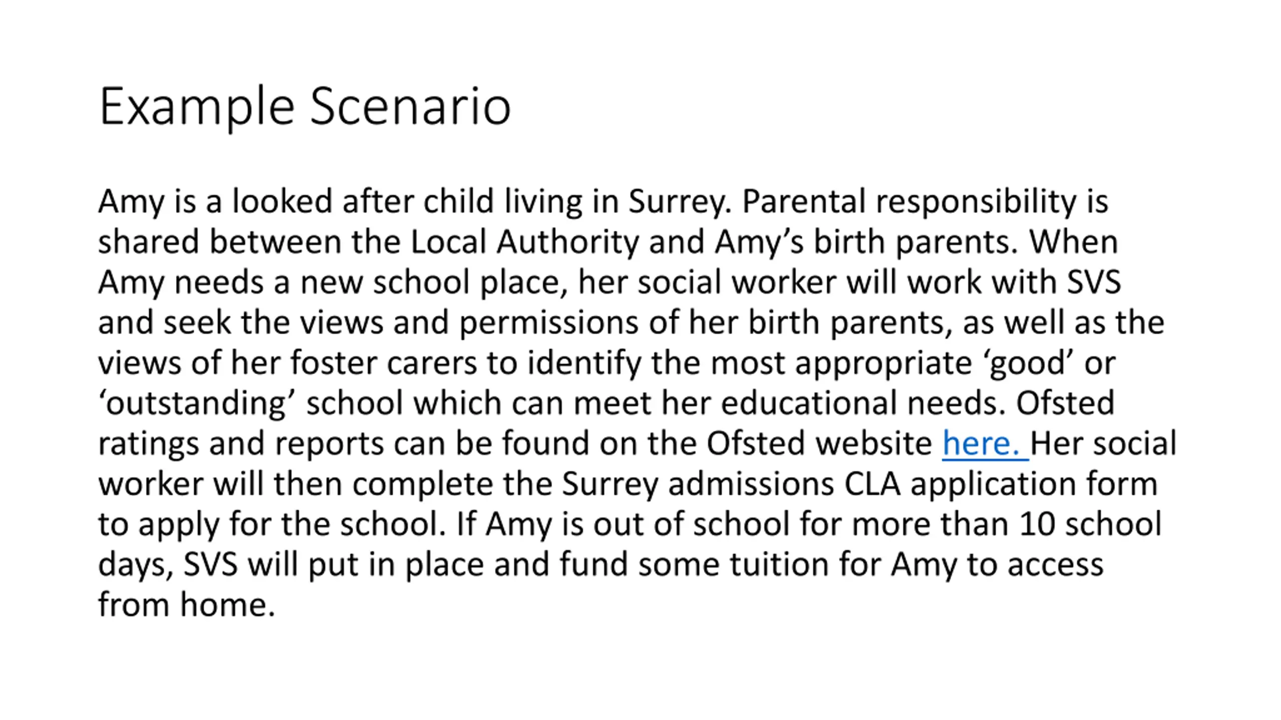 Example Scenario Amy is a looked after child living in Surrey. Parental responsibility is shared between the Local Authority and Amy s birth parents. When Amy needs a new school place, her social worker will work with SVS and seek the views and permissions of her birth parents, as well as the views of her foster carers to identify the most appropriate good or outstanding school which can meet her educational needs. Ofsted ratings and reports can be found on the Ofsted website here. Her social worker will then complete the Surrey admissions CLA application form to apply for the school. If Amy is out of school for more than 10 school days, SVS will put in place and fund some tuition for Amy to access from home.