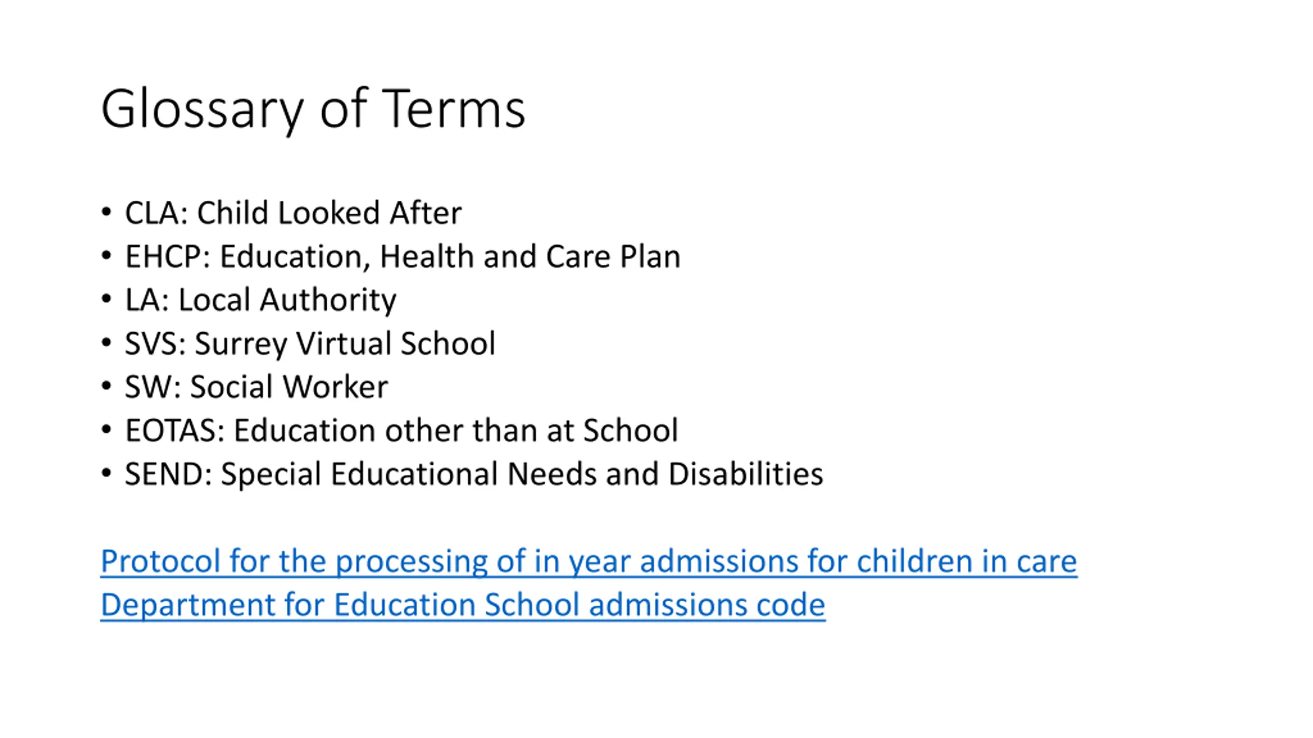 Glossary of Terms CLA: Child Looked After EHCP: Education, Health and Care Plan LA: Local Authority SVS: Surrey Virtual School SW: Social Worker EOTAS: Education other than at School SEND: Special Educational Needs and Disabilities Protocol for the processing of in year admissions for children in care Department for Education School admissions code