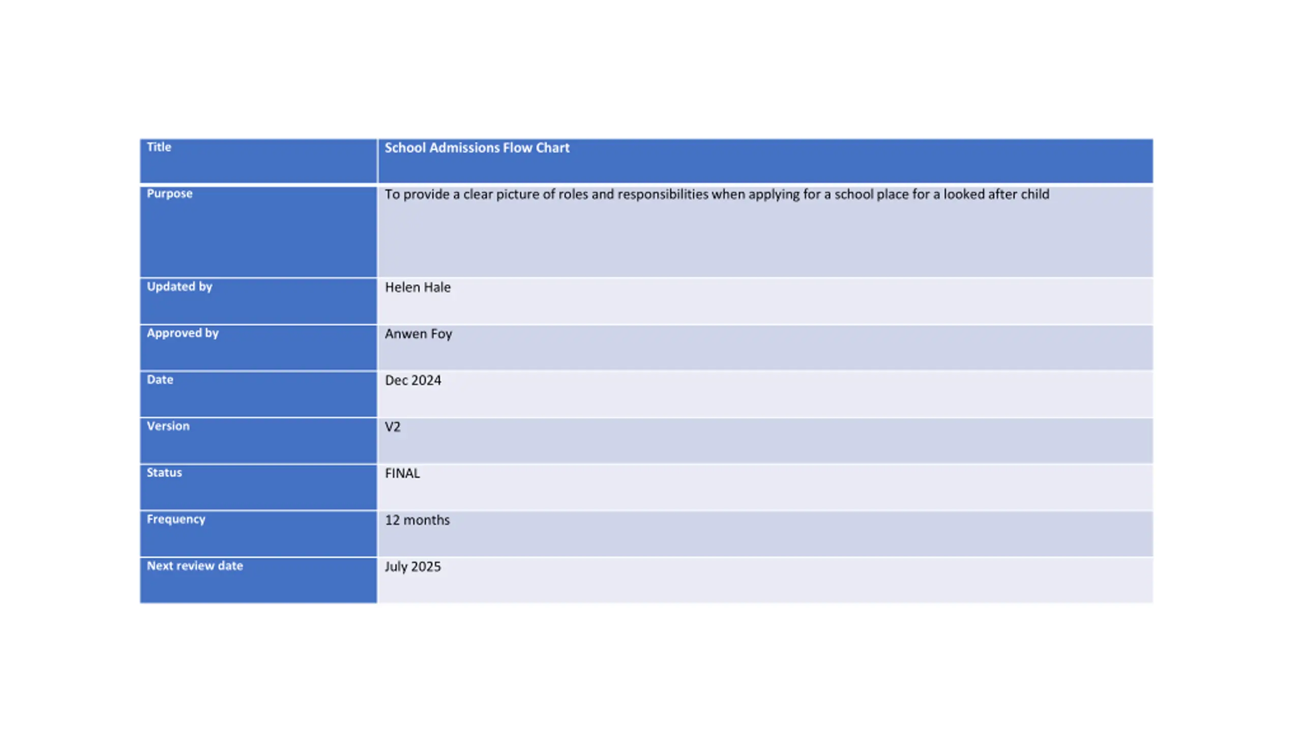 Title School Admissions Flow Chart Purpose To provide a clear picture of roles and responsibilities when applying for a school place for a looked after child Updated by Helen Hale Approved by Anwen Foy Date Dec 2024 Version V2 Status FINAL Frequency 12 months Next review date July 2025