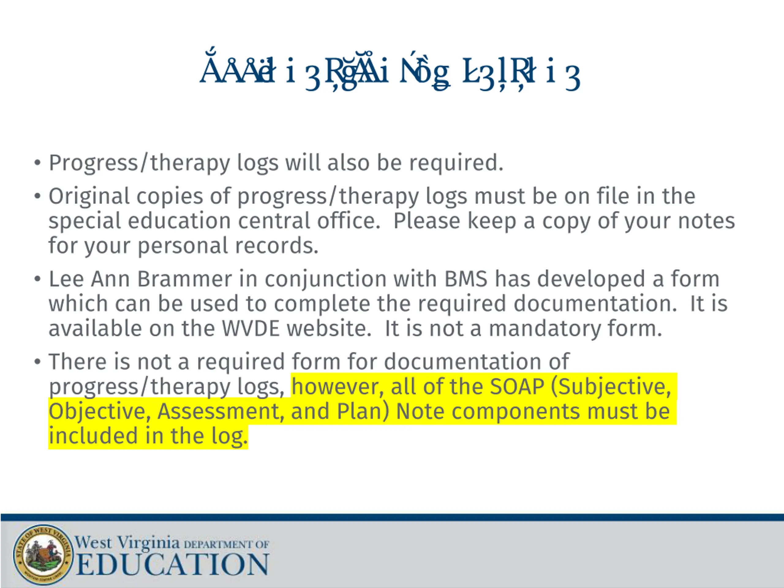 Addi ti o na l Do c um enta ti o n Progress/therapy logs will also be required. Original copies of progress/therapy logs must be on file in the special education central office. Please keep a copy of your notes for your personal records. Lee Ann Brammer in conjunction with BMS has developed a form which can be used to complete the required documentation. It is available on the WVDE website. It is not a mandatory form. There is not a required form for documentation of progress/therapy logs, however, all of the SOAP (Subjective, Objective, Assessment, and Plan) Note components must be included in the log.
