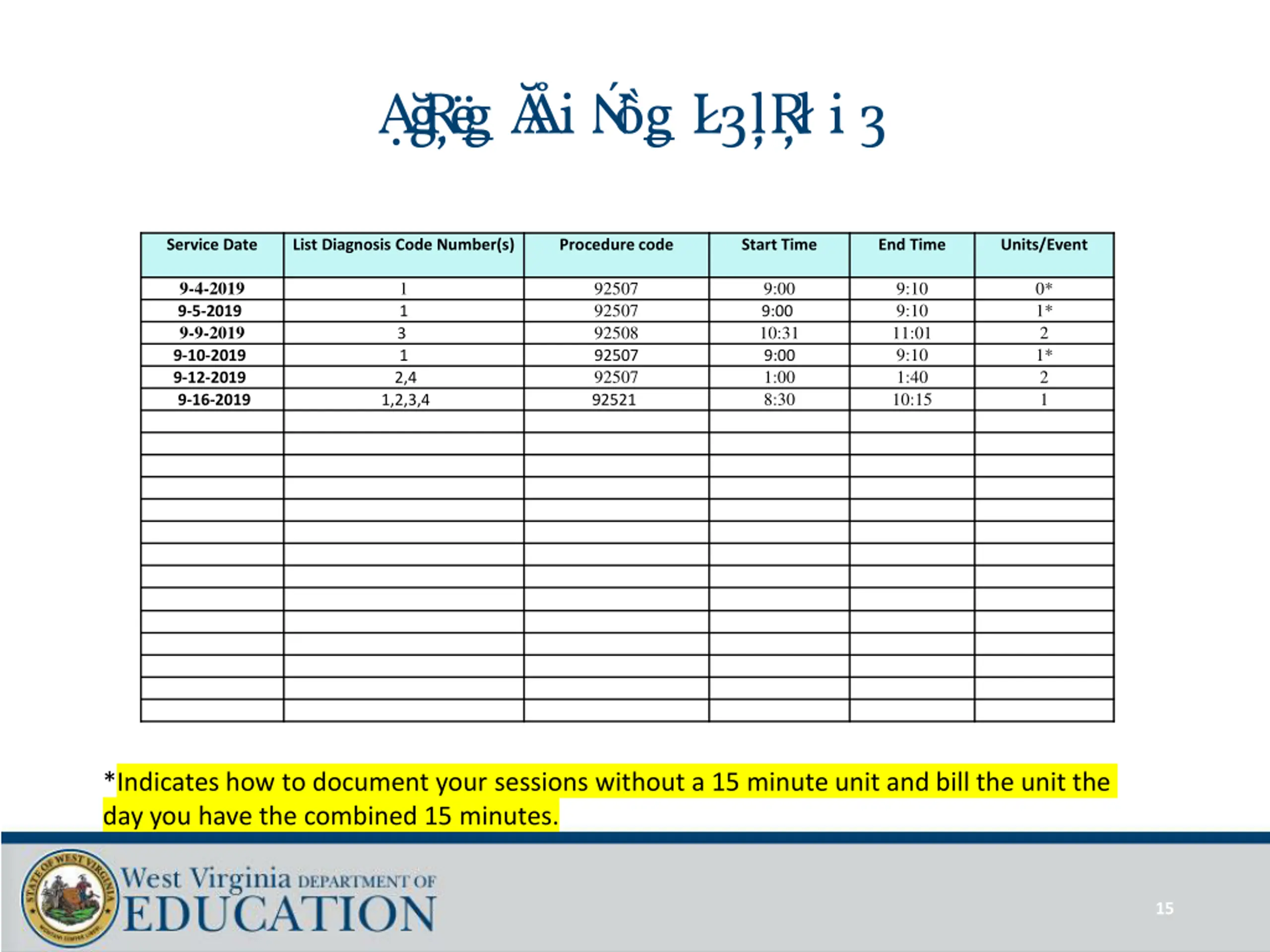 Cl a i m Do c um enta ti o n Service Date List Diagnosis Code Number(s) Procedure code Start Time End Time Units/Event 9-4-2019 9-5-2019 9-9-2019 9-10-2019 9-12-2019 9-16-2019 1 1 3 1 2,4 92507 92507 92508 92507 92507 92521 9:00 9:00 10:31 9:00 1:00 8:30 9:10 9:10 11:01 9:10 1:40 10:15 0* 1* 2 1* 2 1 1,2,3,4 *Indicates how to document your sessions without a 15 minute unit and bill the unit the day you have the combined 15 minutes. 15