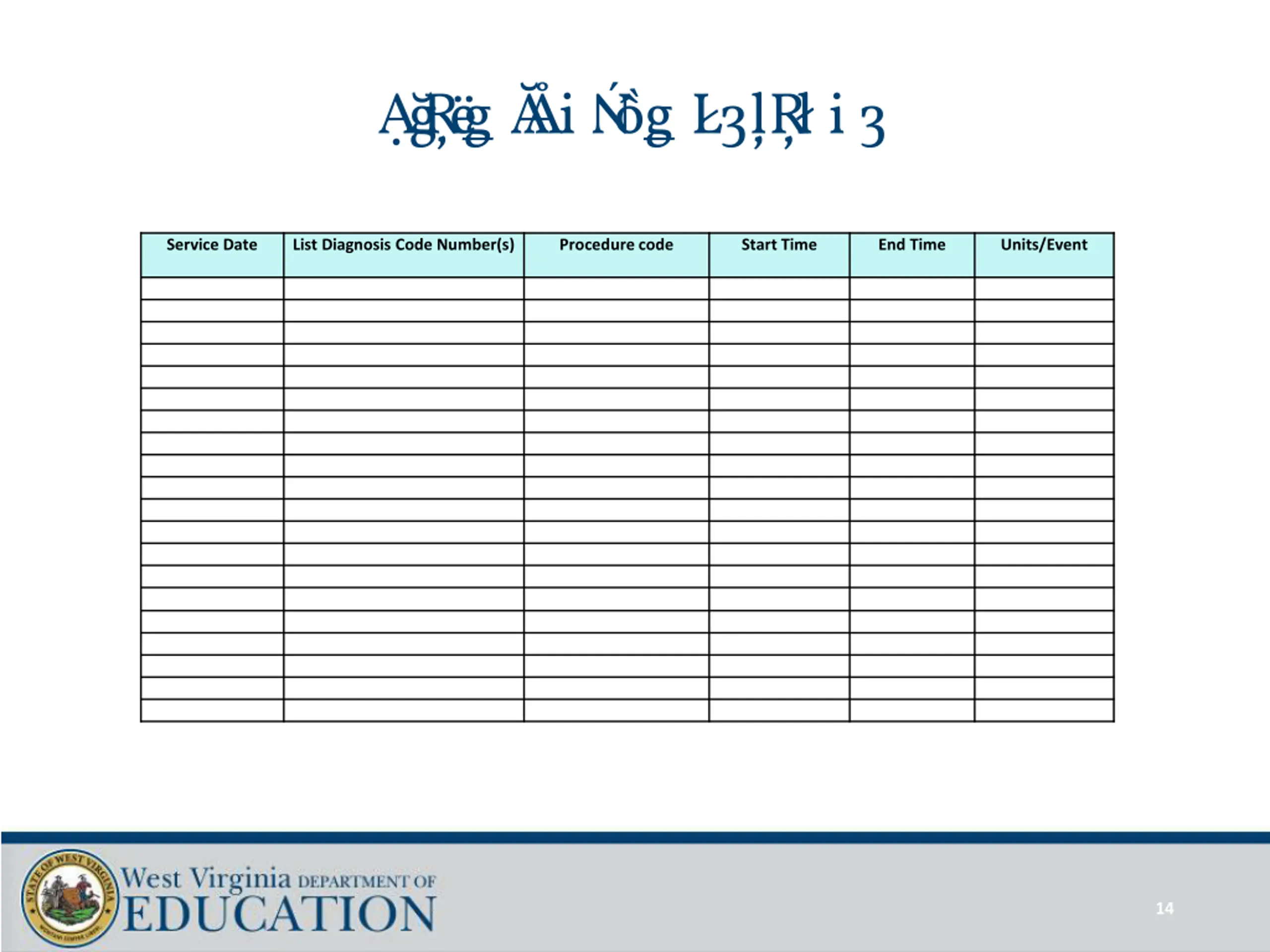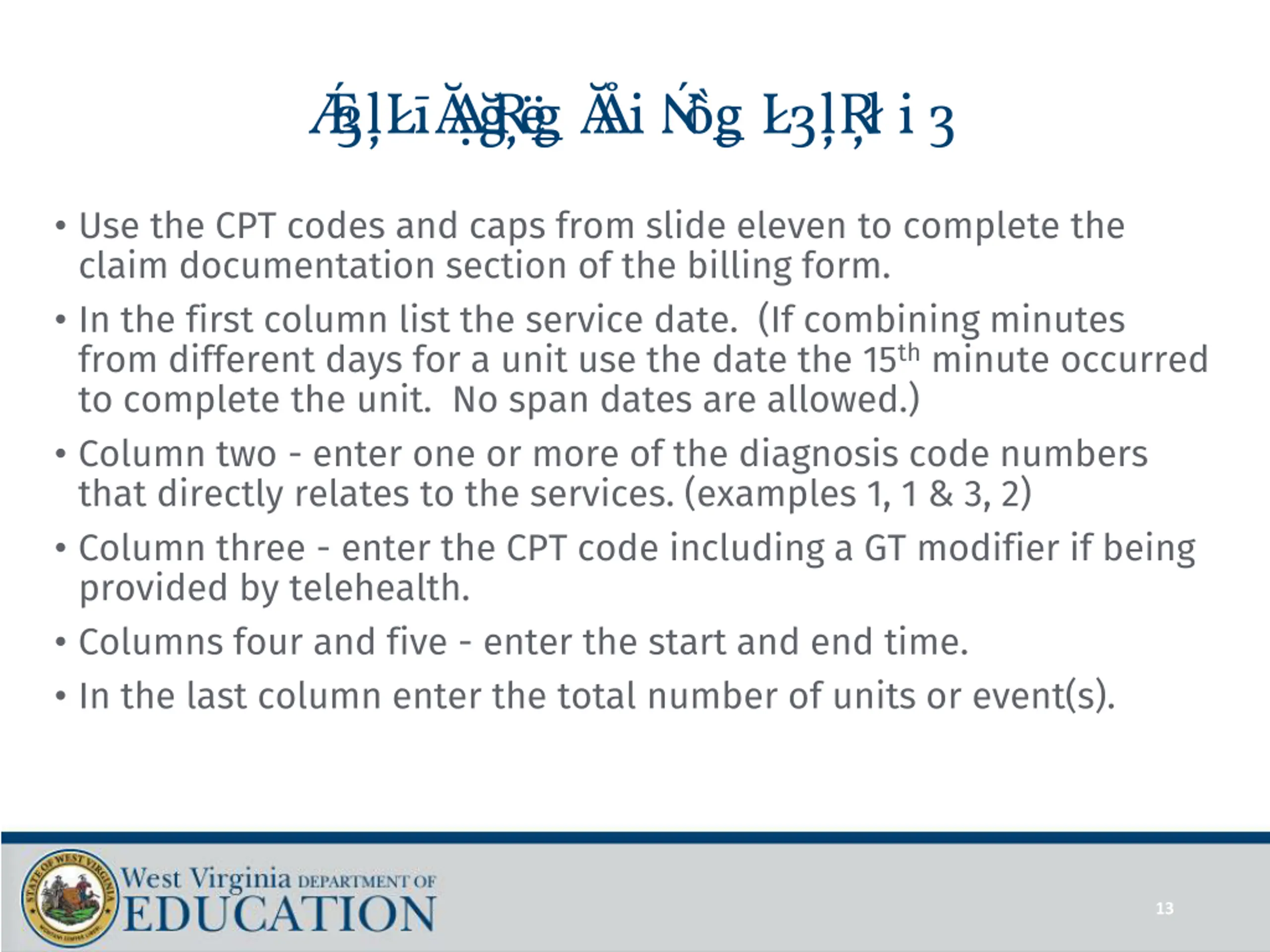 E nter Cl a i m Do c um enta ti o n Use the CPT codes and caps from slide eleven to complete the claim documentation section of the billing form. In the first column list the service date. (If combining minutes from different days for a unit use the date the 15th minute occurred to complete the unit. No span dates are allowed.) Column two - enter one or more of the diagnosis code numbers that directly relates to the services. (examples 1, 1 & 3, 2) Column three - enter the CPT code including a GT modifier if being provided by telehealth. Columns four and five - enter the start and end time. In the last column enter the total number of units or event(s). 13