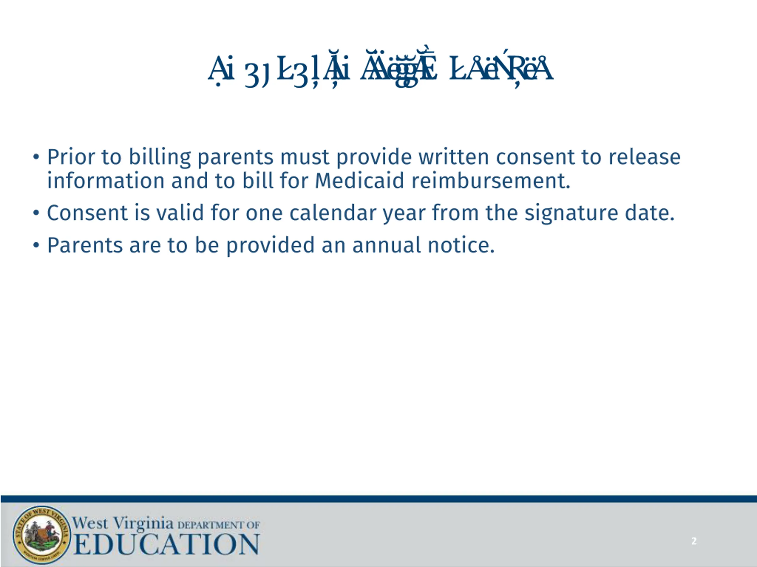 Co nsent to Bi l l M edi c a i d Prior to billing parents must provide written consent to release information and to bill for Medicaid reimbursement. Consent is valid for one calendar year from the signature date. Parents are to be provided an annual notice. 2