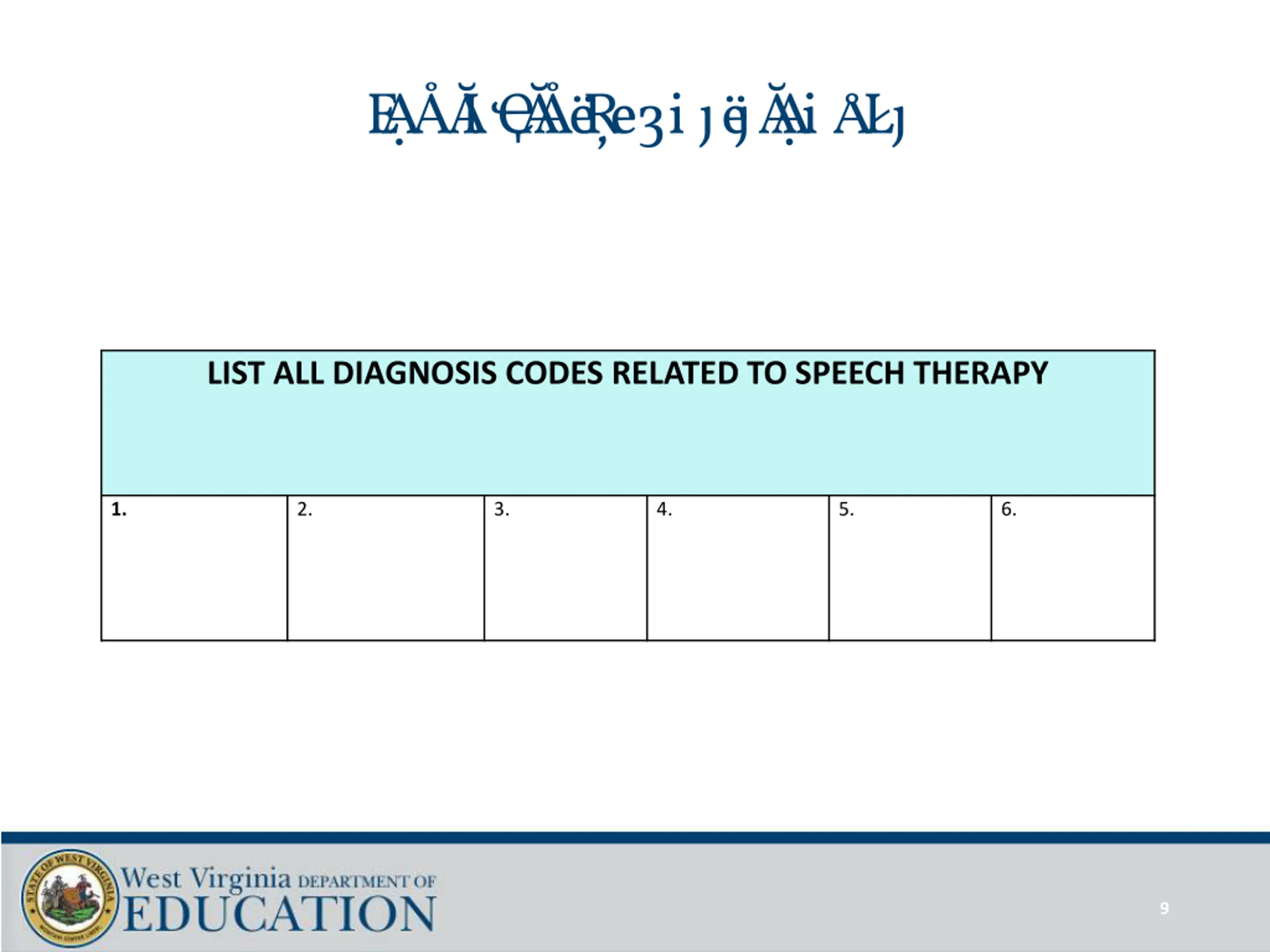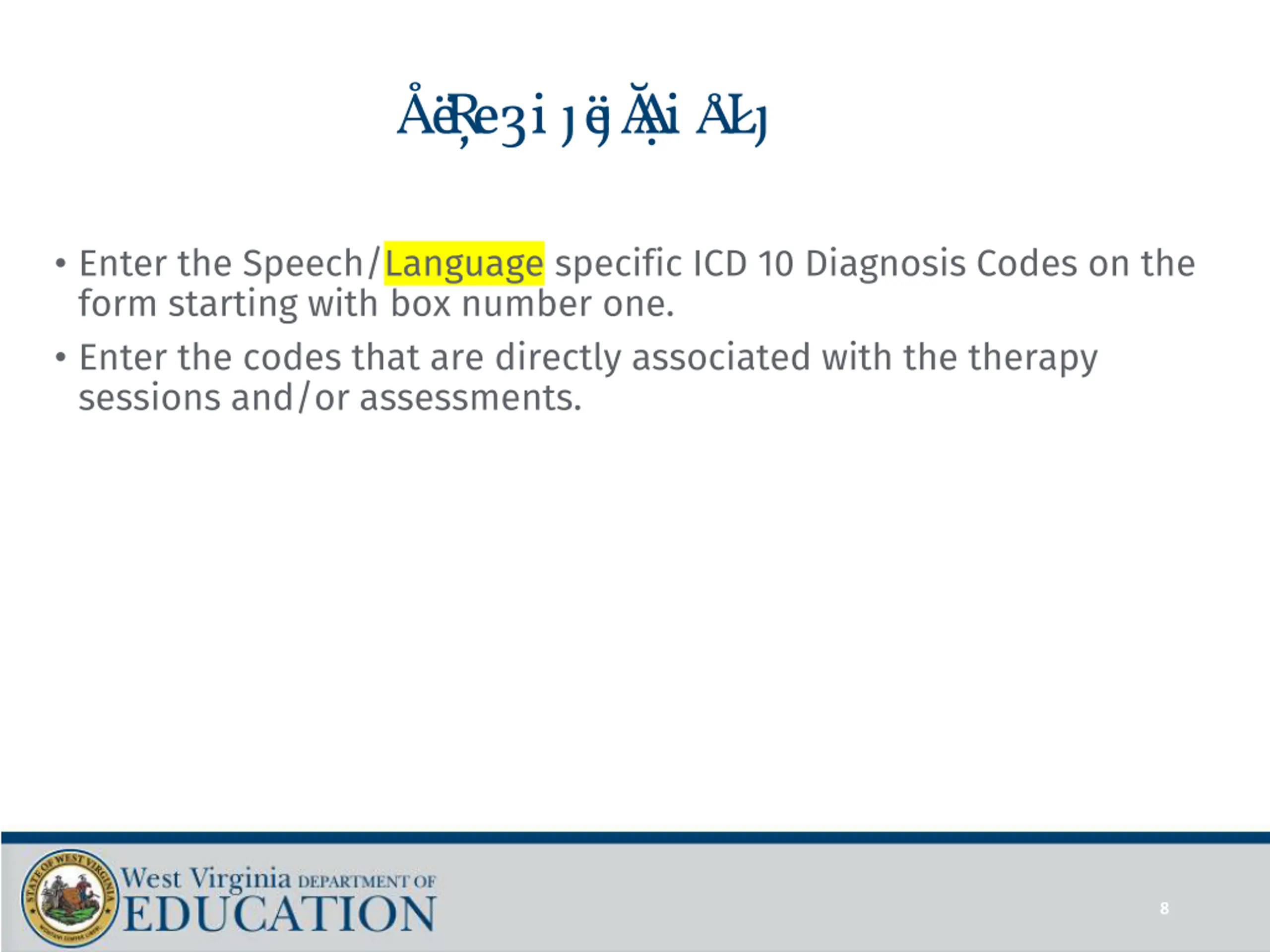 Di a gno si s Co des Enter the Speech/Language specific ICD 10 Diagnosis Codes on the form starting with box number one. Enter the codes that are directly associated with the therapy sessions and/or assessments. 8