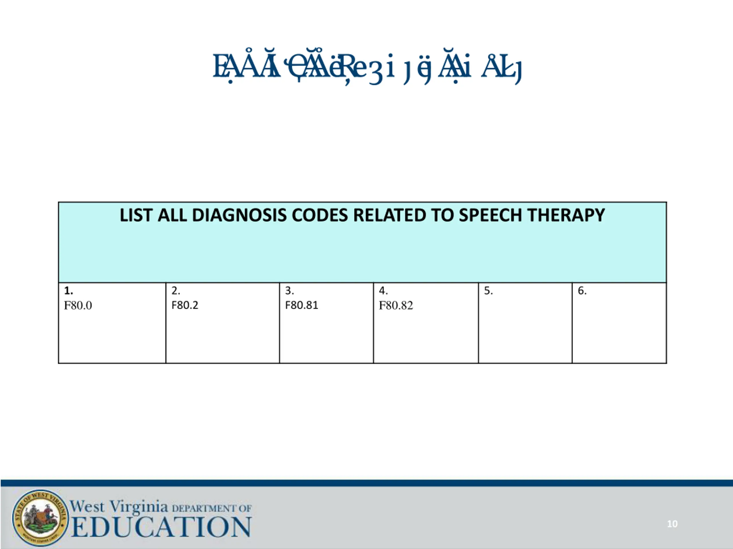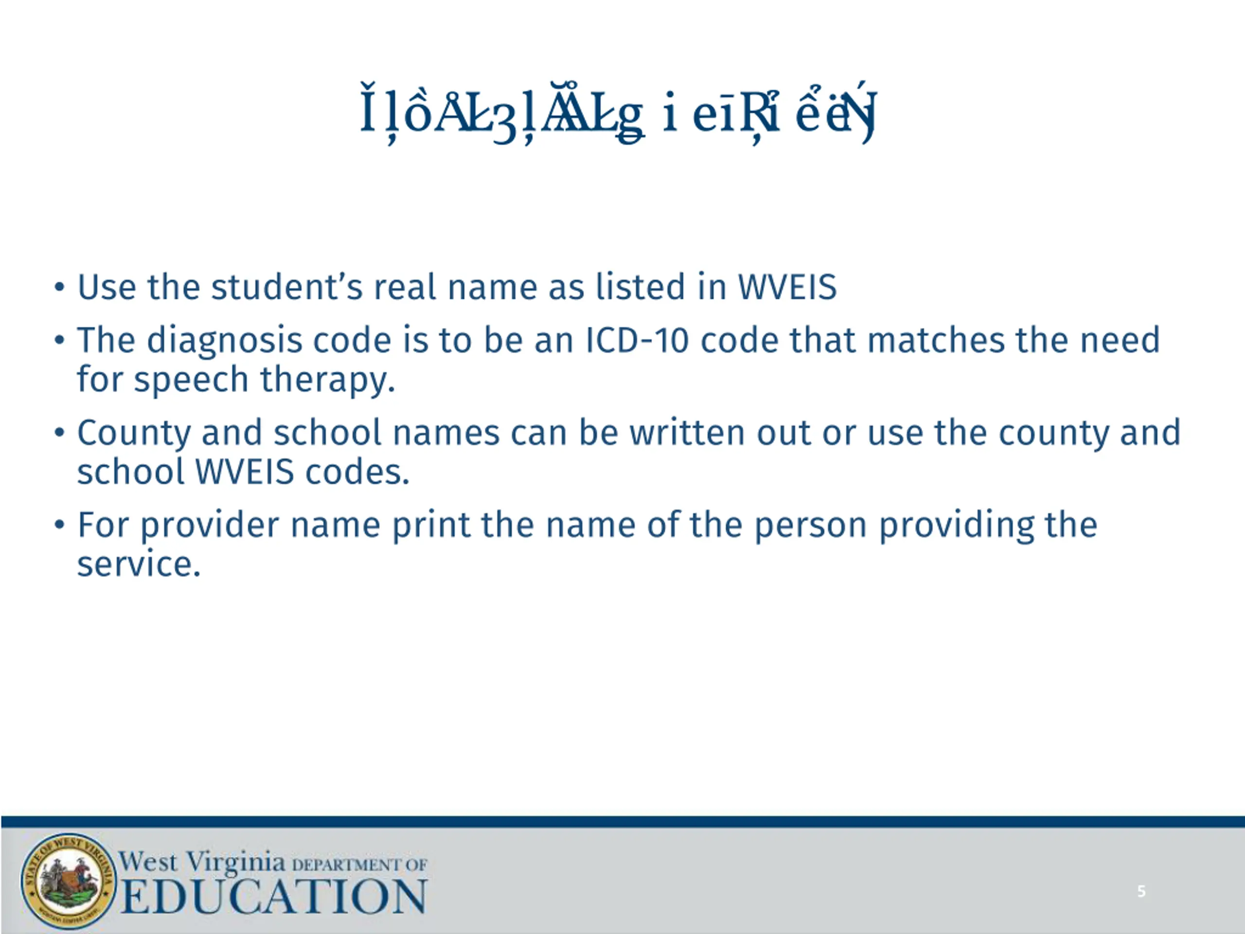 Student Dem o gra p hi c s Use the student s real name as listed in WVEIS The diagnosis code is to be an ICD-10 code that matches the need for speech therapy. County and school names can be written out or use the county and school WVEIS codes. For provider name print the name of the person providing the service. 5