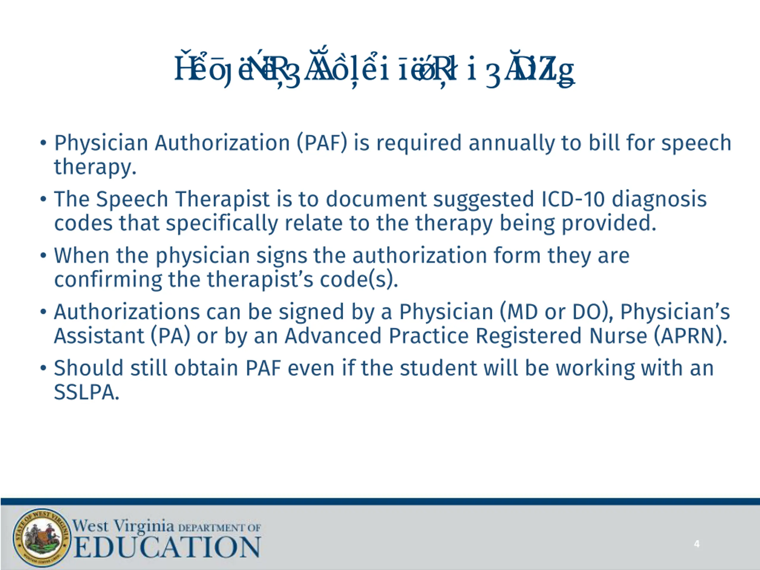 P hysi c i a n Autho ri za ti o n F o rm Physician Authorization (PAF) is required annually to bill for speech therapy. The Speech Therapist is to document suggested ICD-10 diagnosis codes that specifically relate to the therapy being provided. When the physician signs the authorization form they are confirming the therapist s code(s). Authorizations can be signed by a Physician (MD or DO), Physician s Assistant (PA) or by an Advanced Practice Registered Nurse (APRN). Should still obtain PAF even if the student will be working with an SSLPA. 4