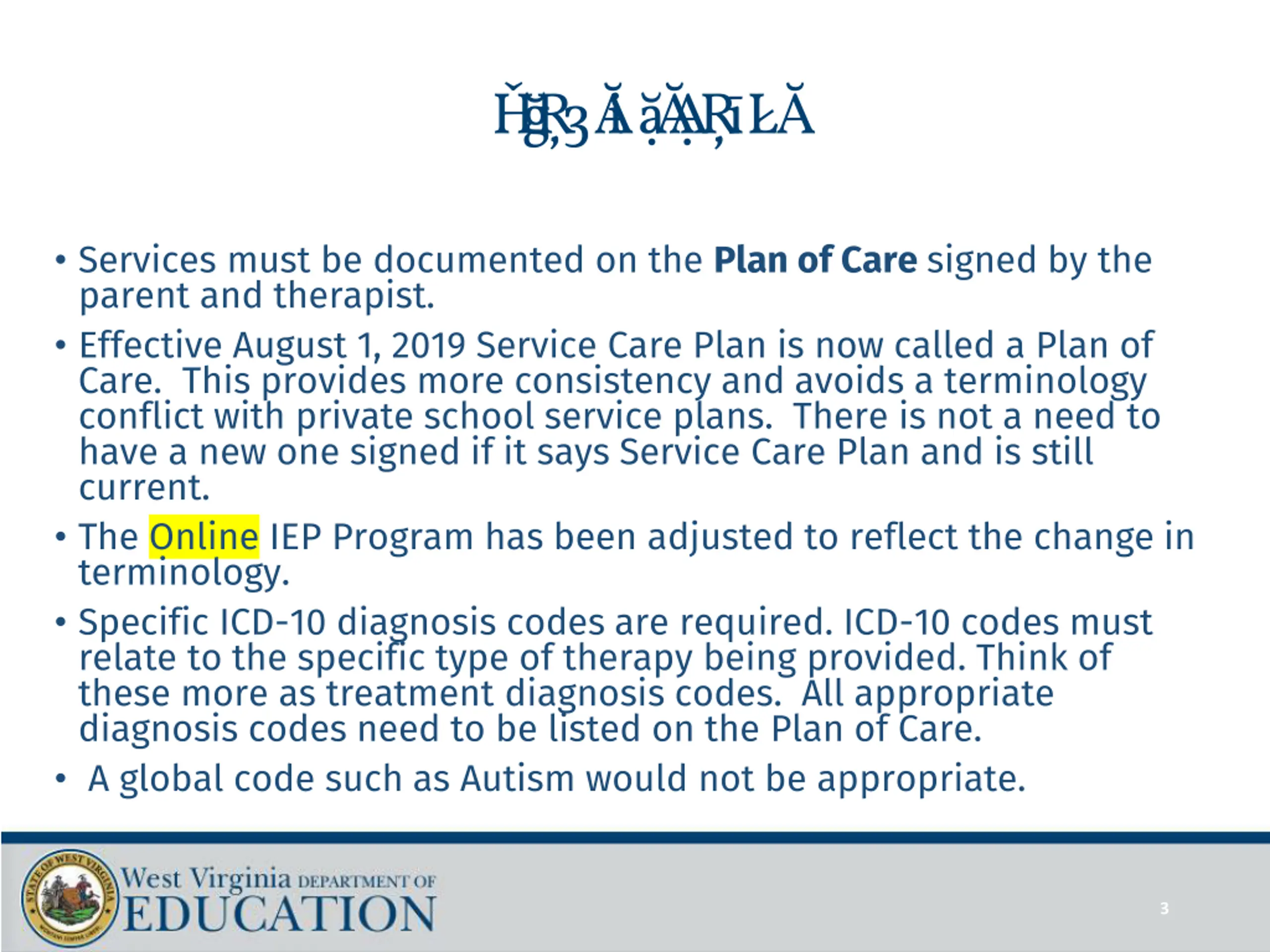 P l a n o f Ca re Services must be documented on the Plan of Care signed by the parent and therapist. Effective August 1, 2019 Service Care Plan is now called a Plan of Care. This provides more consistency and avoids a terminology conflict with private school service plans. There is not a need to have a new one signed if it says Service Care Plan and is still current. The Online IEP Program has been adjusted to reflect the change in terminology. Specific ICD-10 diagnosis codes are required. ICD-10 codes must relate to the specific type of therapy being provided. Think of these more as treatment diagnosis codes. All appropriate diagnosis codes need to be listed on the Plan of Care. A global code such as Autism would not be appropriate. 3