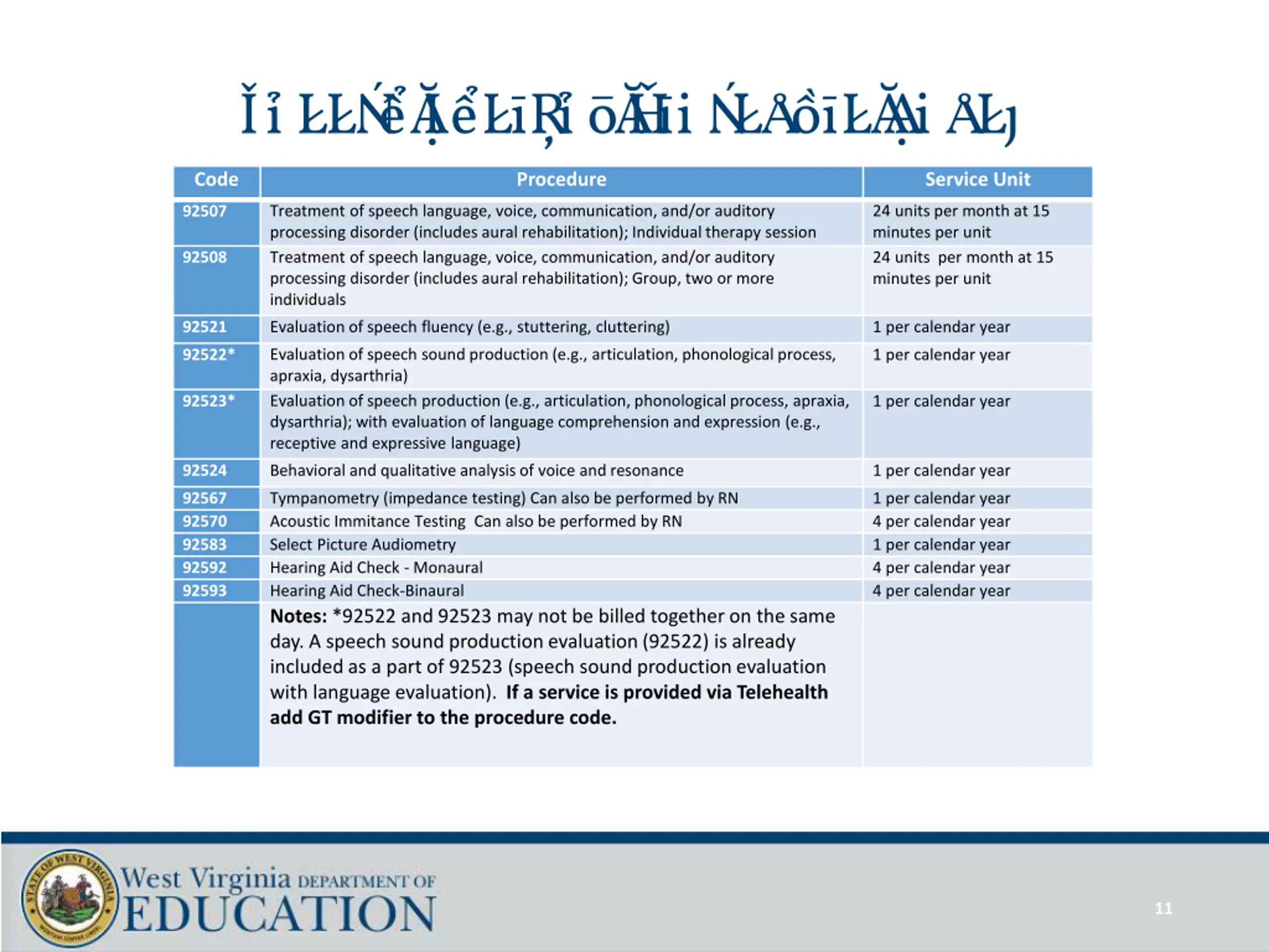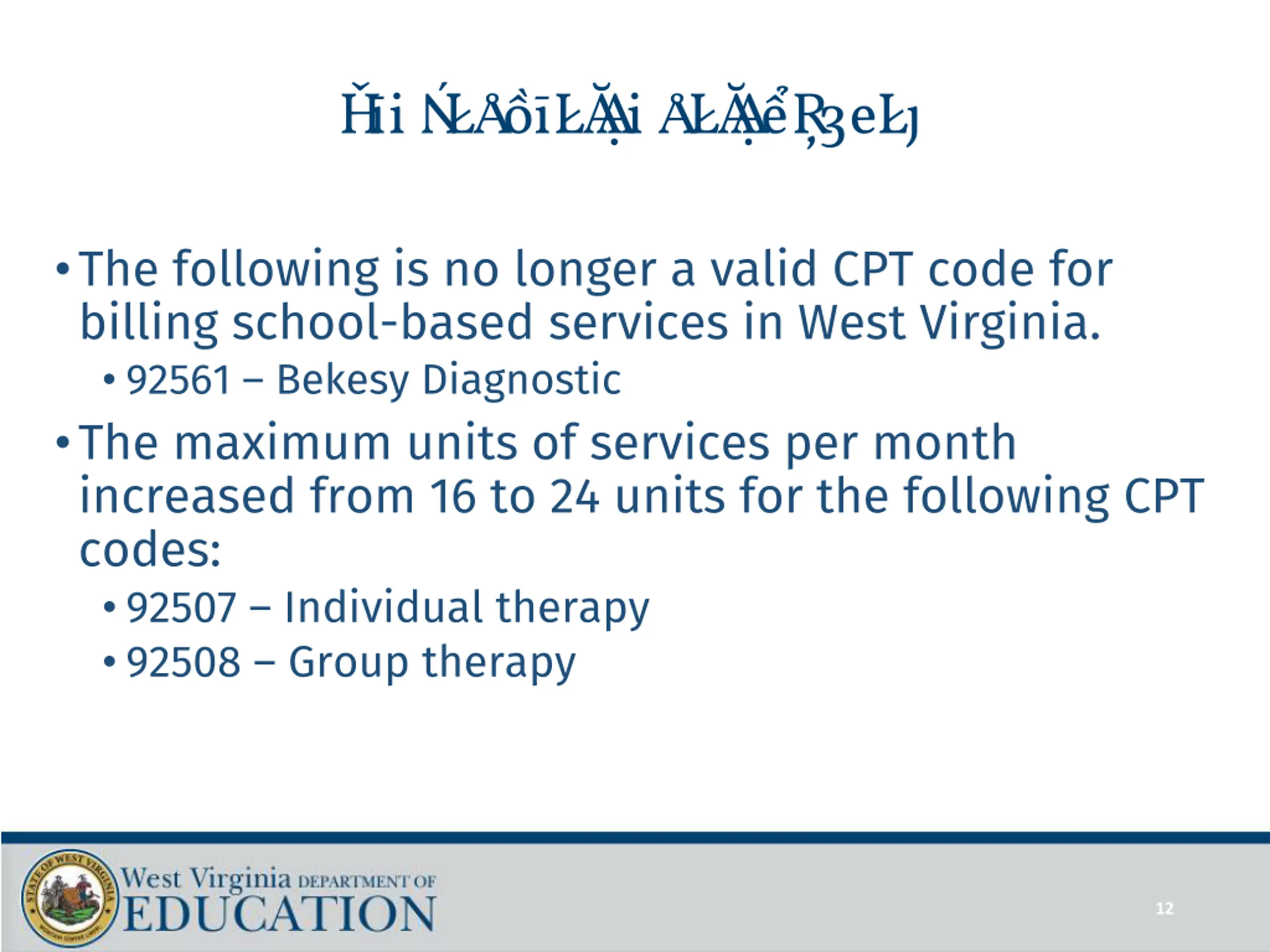 P ro c edure Co de Cha nges The following is no longer a valid CPT code for billing school-based services in West Virginia. 92561 Bekesy Diagnostic The maximum units of services per month increased from 16 to 24 units for the following CPT codes: 92507 Individual therapy 92508 Group therapy 12