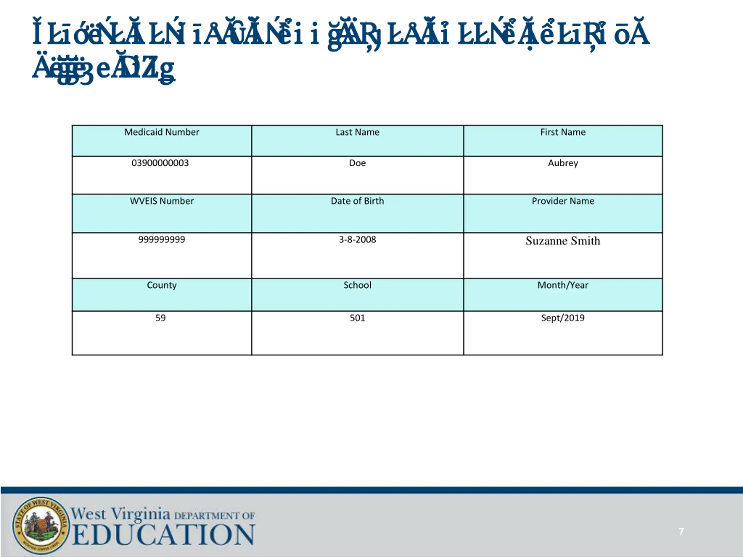 Servi c e Rec o rd Servi c e Rec o rd Sc ho o l Based Sp eec h Therap y Sc ho o l Based Sp eec h Therap y Bi l l i ng F o rm Bi l l i ng F o rm Medicaid Number Last Name First Name 03900000003 Doe Aubrey WVEIS Number Date of Birth Provider Name Suzanne Smith 999999999 3-8-2008 County School Month/Year 59 501 Sept/2019 7