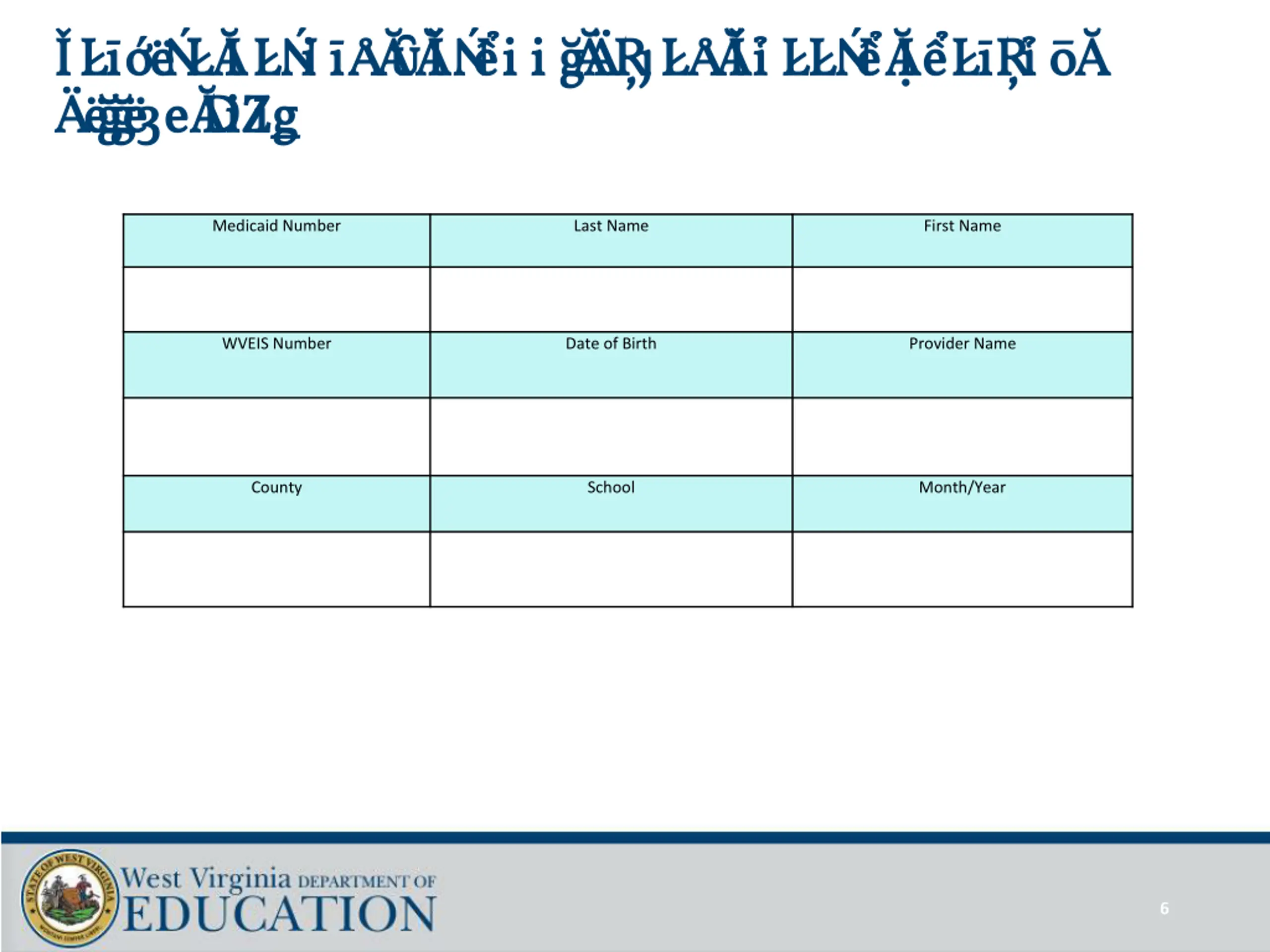 Servi c e Rec o rd Servi c e Rec o rd Sc ho o l Based Sp eec h Therap y Sc ho o l Based Sp eec h Therap y Bi l l i ng F o rm Bi l l i ng F o rm Medicaid Number Last Name First Name WVEIS Number Date of Birth Provider Name County School Month/Year 6
