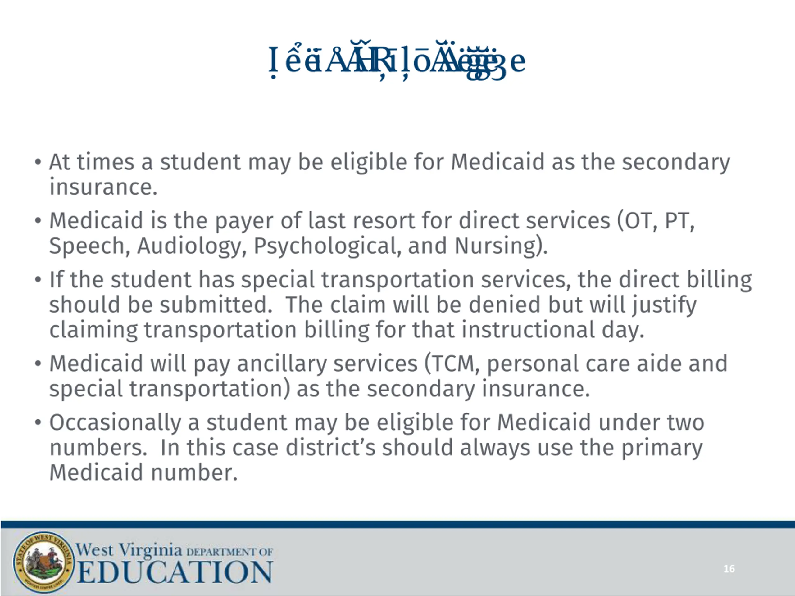 Thi rd P a rty Bi l l i ng At times a student may be eligible for Medicaid as the secondary insurance. Medicaid is the payer of last resort for direct services (OT, PT, Speech, Audiology, Psychological, and Nursing). If the student has special transportation services, the direct billing should be submitted. The claim will be denied but will justify claiming transportation billing for that instructional day. Medicaid will pay ancillary services (TCM, personal care aide and special transportation) as the secondary insurance. Occasionally a student may be eligible for Medicaid under two numbers. In this case district s should always use the primary Medicaid number. 16