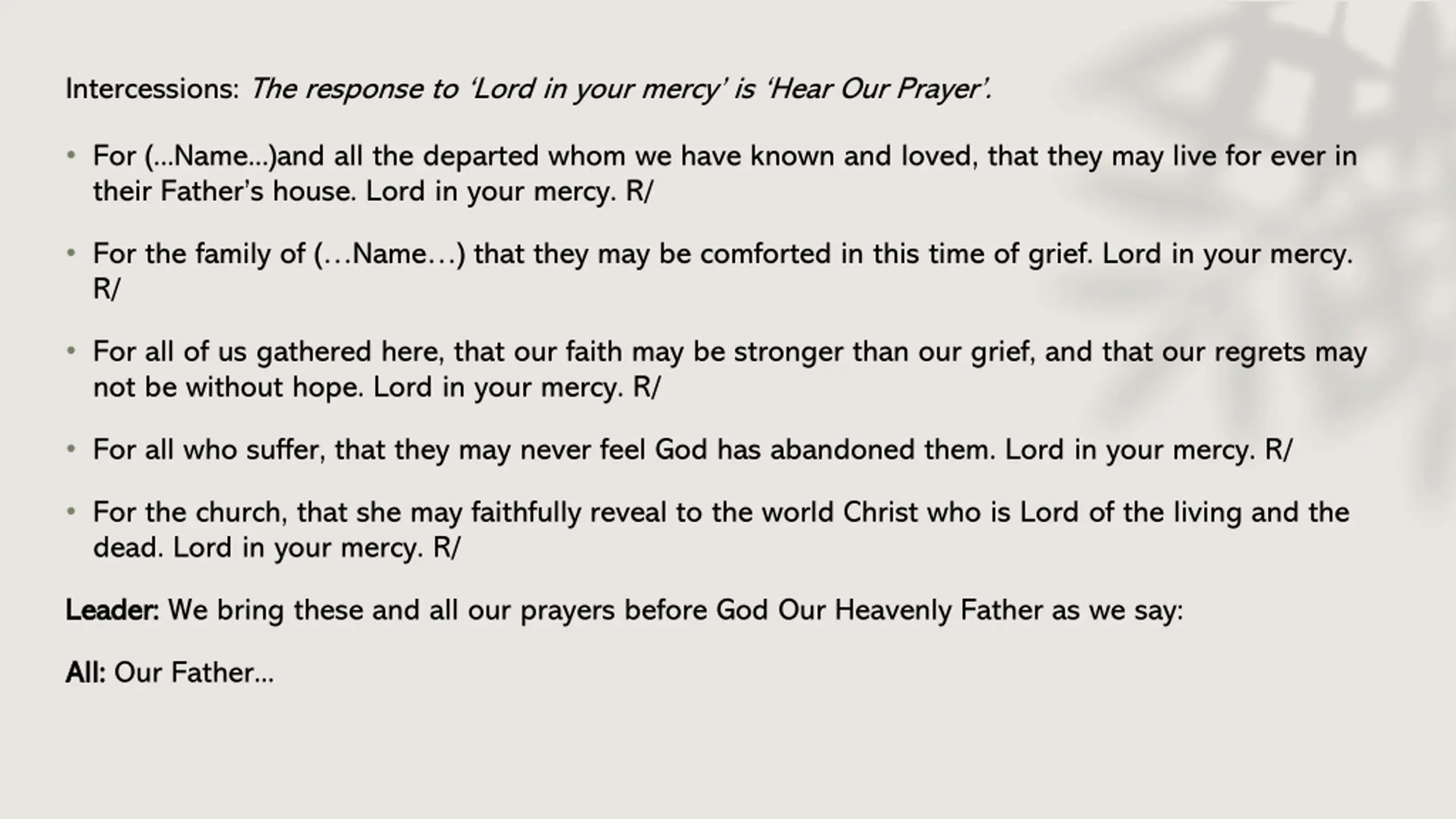 Intercessions: The response to Lord in your mercy is Hear Our Prayer. For (...Name...)and all the departed whom we have known and loved, that they may live for ever in their Father s house. Lord in your mercy. R/ For the family of ( Name ) that they may be comforted in this time of grief. Lord in your mercy. R/ For all of us gathered here, that our faith may be stronger than our grief, and that our regrets may not be without hope. Lord in your mercy. R/ For all who suffer, that they may never feel God has abandoned them. Lord in your mercy. R/ For the church, that she may faithfully reveal to the world Christ who is Lord of the living and the dead. Lord in your mercy. R/ Leader: Leader: We bring these and all our prayers before God Our Heavenly Father as we say: All: All: Our Father...