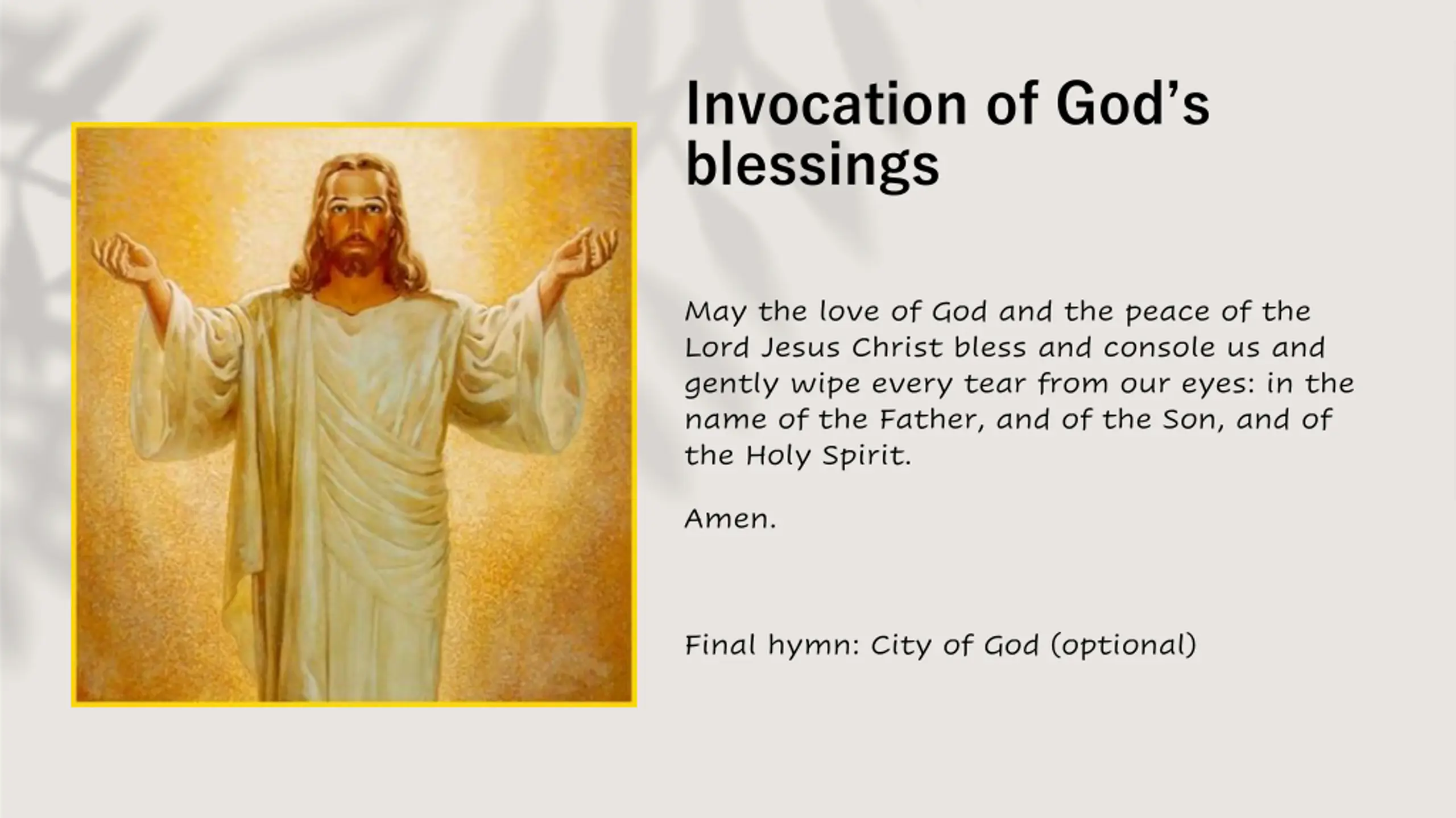 Invocation of Gods blessings May the love of God and the peace of the Lord Jesus Christ bless and console us and gently wipe every tear from our eyes: in the name of the Father, and of the Son, and of the Holy Spirit. Amen. Final hymn: City of God (optional)