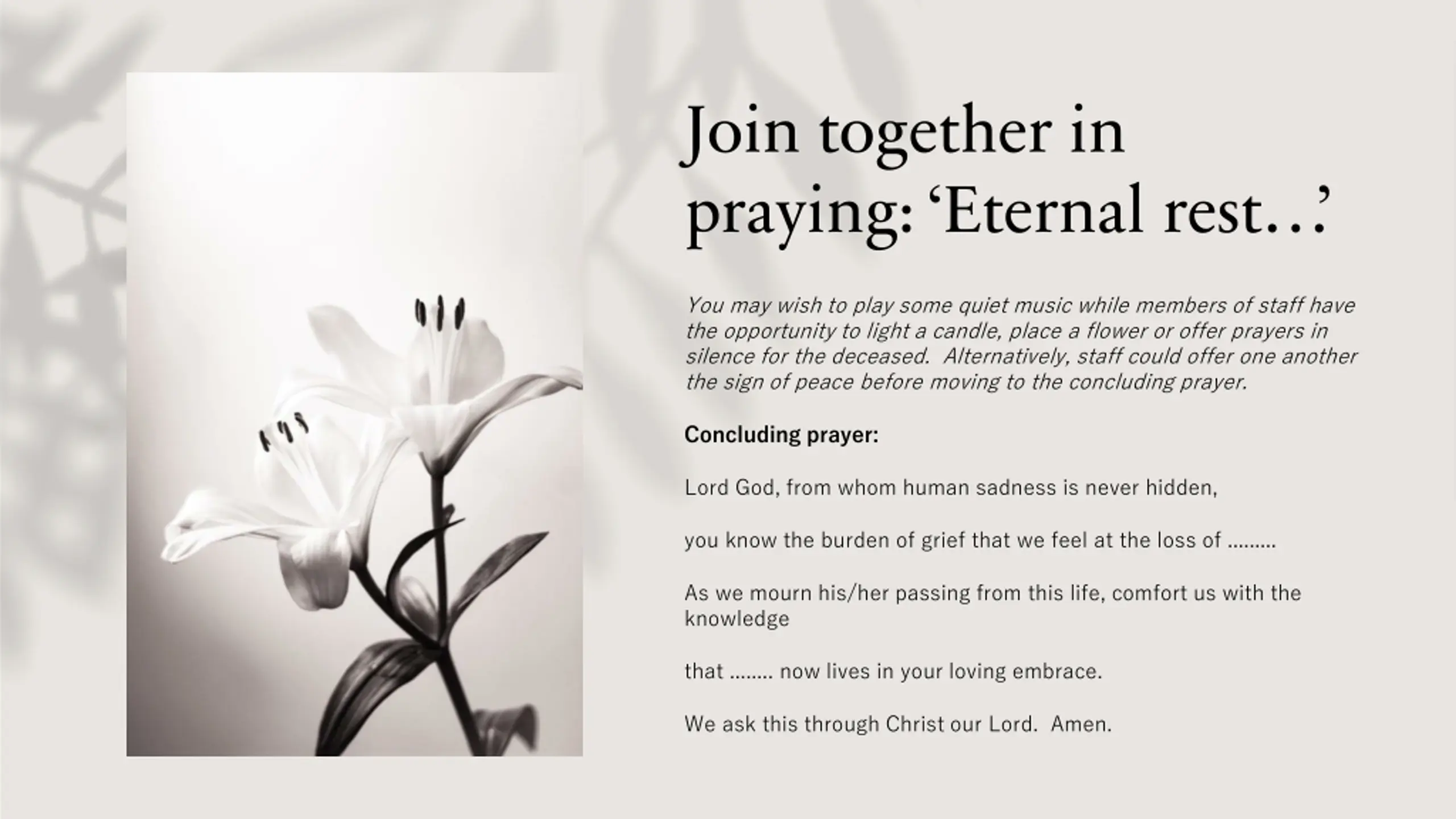 Join together in praying: Eternal rest You may wish to play some quiet music while members of staff have the opportunity to light a candle, place a flower or offer prayers in silence for the deceased. Alternatively, staff could offer one another the sign of peace before moving to the concluding prayer. Concluding prayer: Lord God, from whom human sadness is never hidden, you know the burden of grief that we feel at the loss of ......... As we mourn his/her passing from this life, comfort us with the knowledge that ........ now lives in your loving embrace. We ask this through Christ our Lord. Amen.