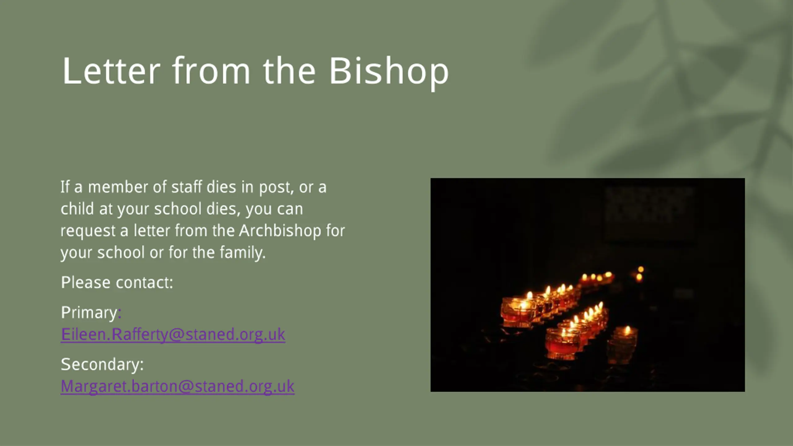 Letter from the Bishop If a member of staff dies in post, or a child at your school dies, you can request a letter from the Archbishop for your school or for the family. Please contact: Primary: Eileen.Rafferty@staned.org.uk Secondary: Margaret.barton@staned.org.uk