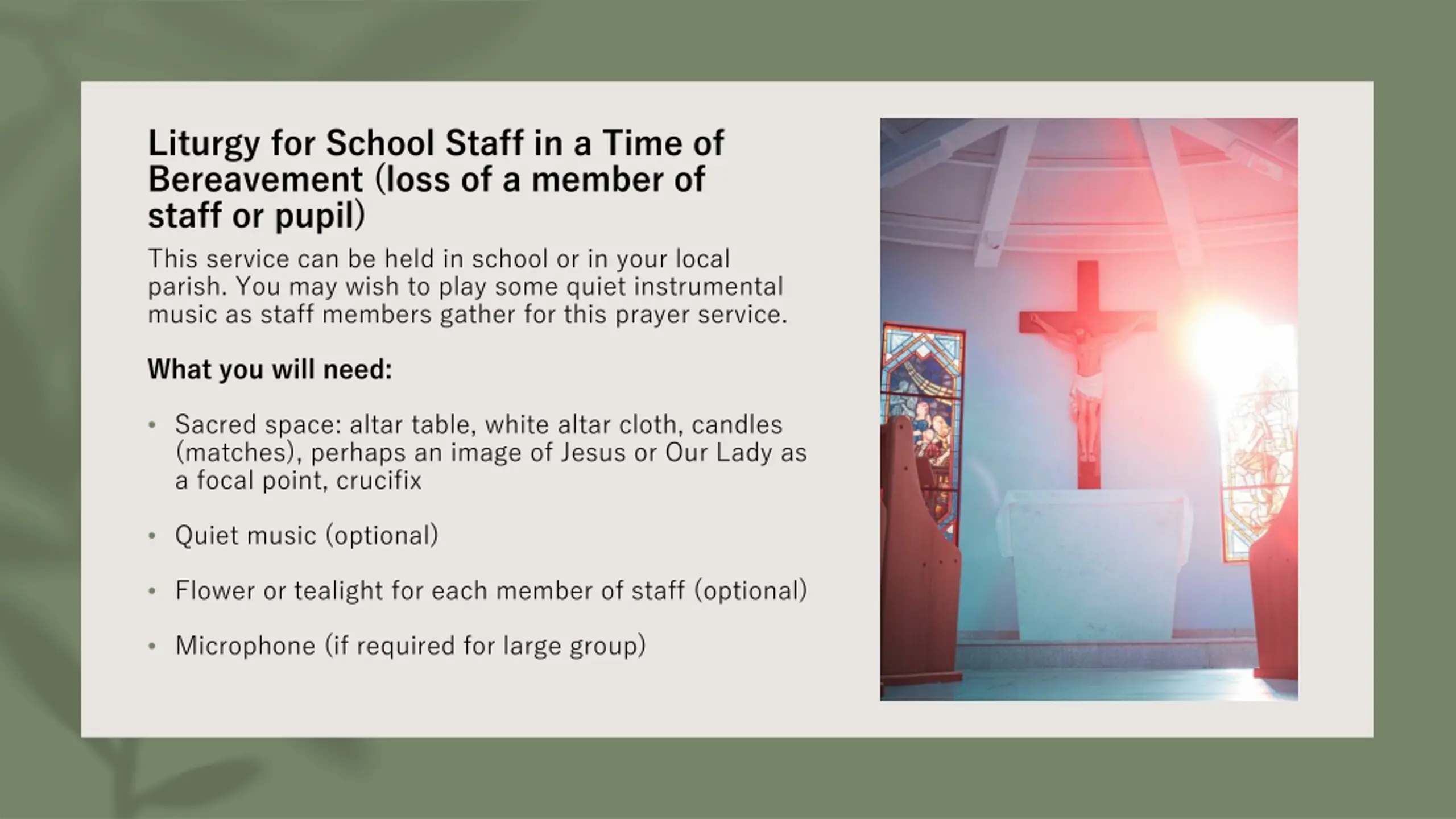 Liturgy for School Staff in a Time of Bereavement (loss of a member of staff or pupil) This service can be held in school or in your local parish. You may wish to play some quiet instrumental music as staff members gather for this prayer service. What you will need: Sacred space: altar table, white altar cloth, candles (matches), perhaps an image of Jesus or Our Lady as a focal point, crucifix Quiet music (optional) Flower or tealight for each member of staff (optional) Microphone (if required for large group)