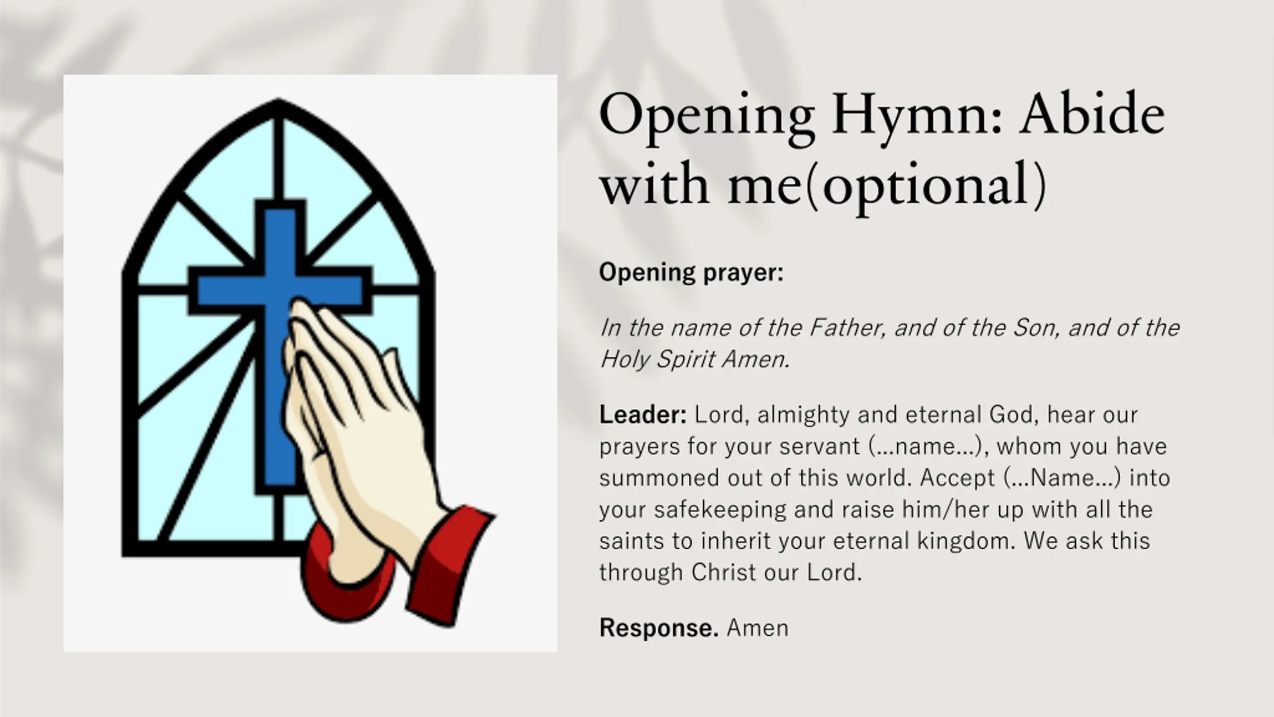 Opening Hymn: Abide with me(optional) Opening prayer: In the name of the Father, and of the Son, and of the Holy Spirit Amen. Leader: Lord, almighty and eternal God, hear our prayers for your servant (...name...), whom you have summoned out of this world. Accept (...Name...) into your safekeeping and raise him/her up with all the saints to inherit your eternal kingdom. We ask this through Christ our Lord. Response. Amen