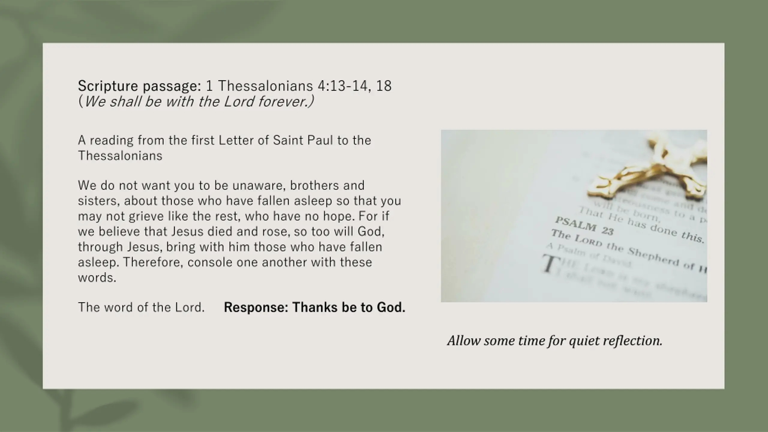 Scripture passage: 1 Thessalonians 4:13-14, 18 (We shall be with the Lord forever.) A reading from the first Letter of Saint Paul to the Thessalonians We do not want you to be unaware, brothers and sisters, about those who have fallen asleep so that you may not grieve like the rest, who have no hope. For if we believe that Jesus died and rose, so too will God, through Jesus, bring with him those who have fallen asleep. Therefore, console one another with these words. The word of the Lord. Response: Thanks be to God. Allow some time for quiet reflection.
