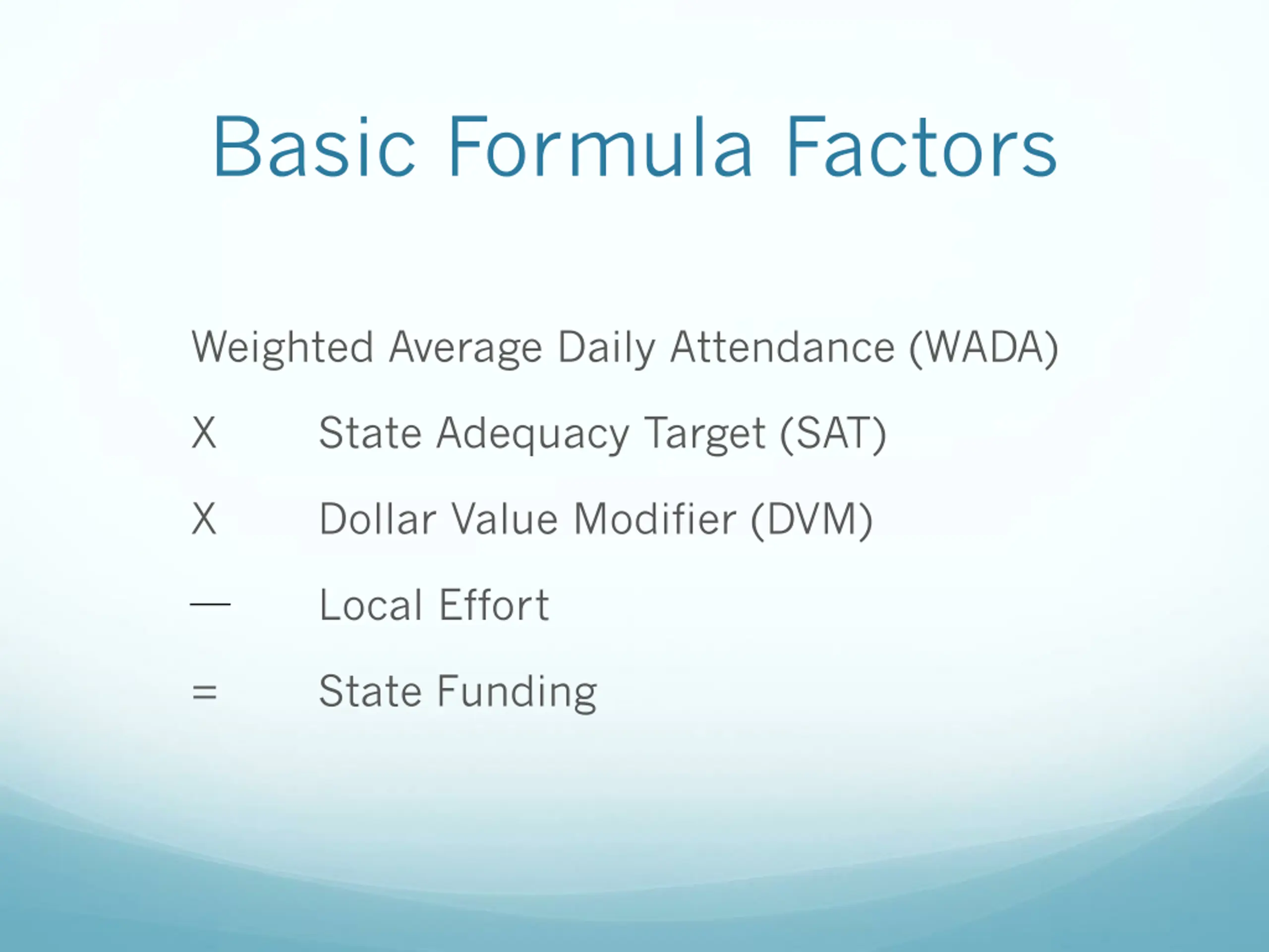 Basic Formula Factors Weighted Average Daily Attendance (WADA) X State Adequacy Target (SAT) X Dollar Value Modifier (DVM) Local Effort = State Funding