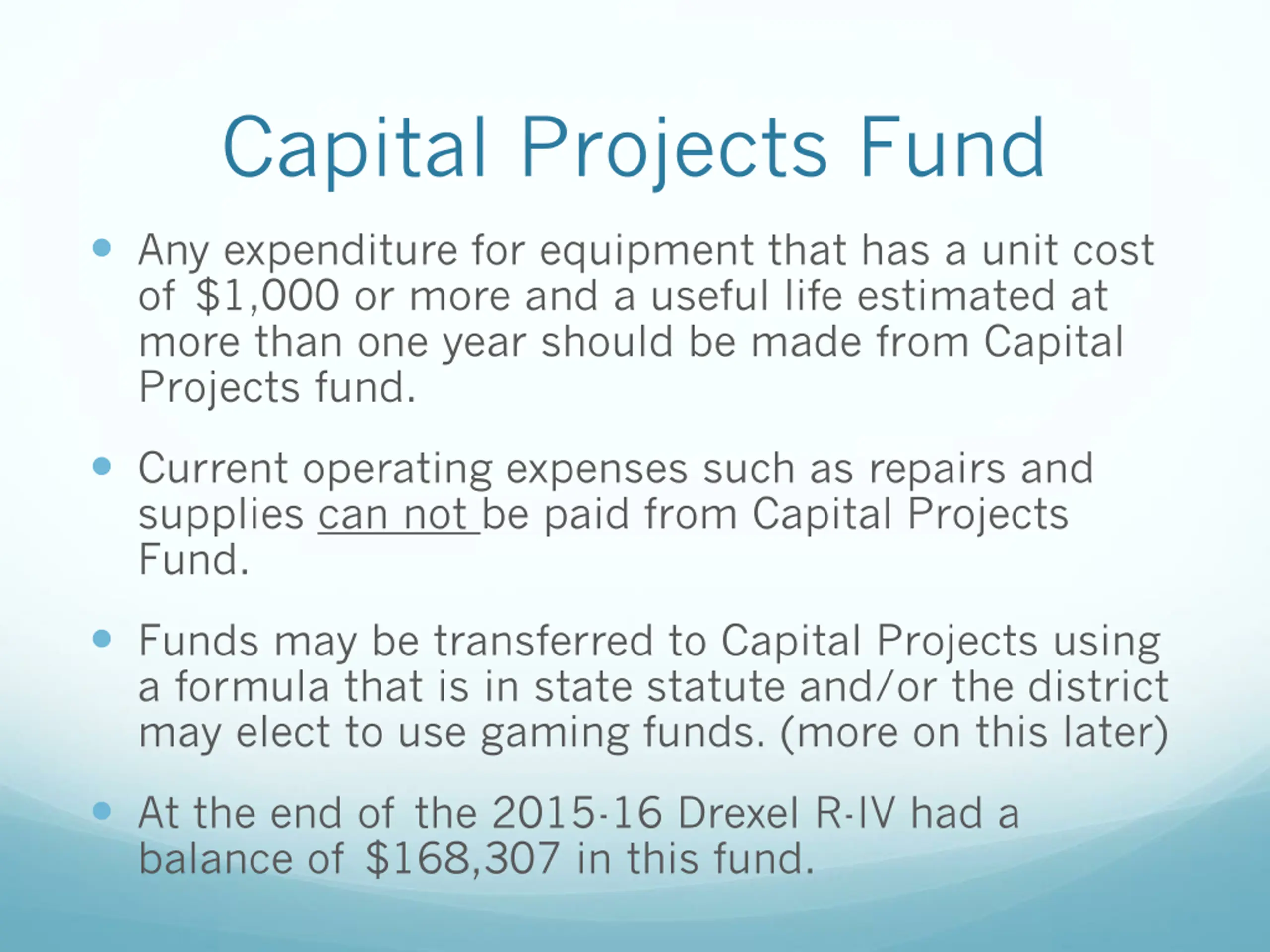 Capital Projects Fund Any expenditure for equipment that has a unit cost of $1,000 or more and a useful life estimated at more than one year should be made from Capital Projects fund. Current operating expenses such as repairs and supplies can not be paid from Capital Projects Fund. Funds may be transferred to Capital Projects using a formula that is in state statute and/or the district may elect to use gaming funds. (more on this later) At the end of the 2015-16 Drexel R-IV had a balance of $168,307 in this fund.