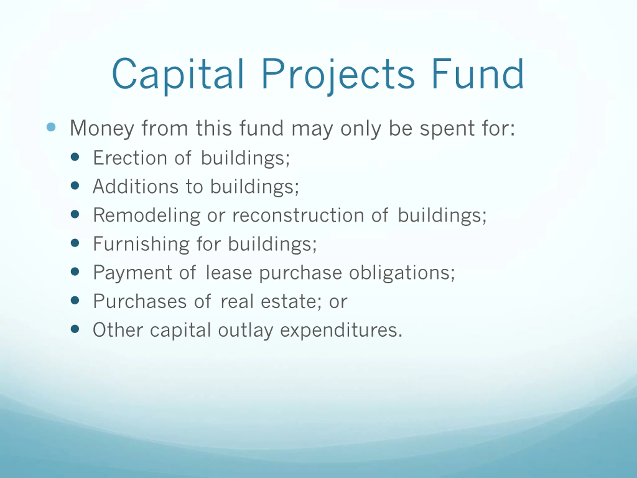Capital Projects Fund Money from this fund may only be spent for: Erection of buildings; Additions to buildings; Remodeling or reconstruction of buildings; Furnishing for buildings; Payment of lease purchase obligations; Purchases of real estate; or Other capital outlay expenditures.