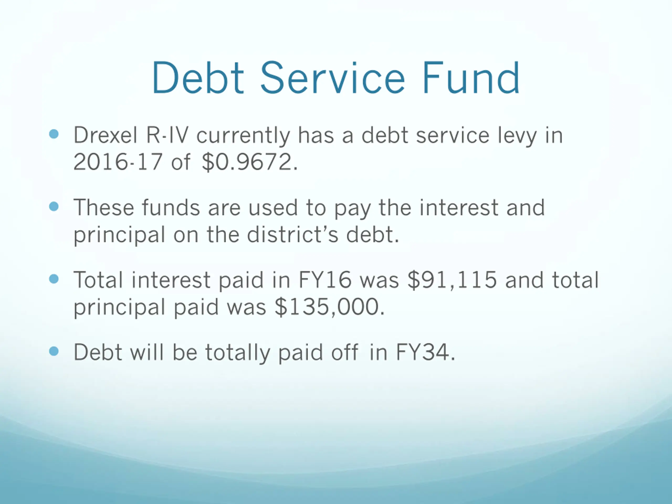 Debt Service Fund Drexel R-IV currently has a debt service levy in 2016-17 of $0.9672. These funds are used to pay the interest and principal on the district s debt. Total interest paid in FY16 was $91,115 and total principal paid was $135,000. Debt will be totally paid off in FY34.