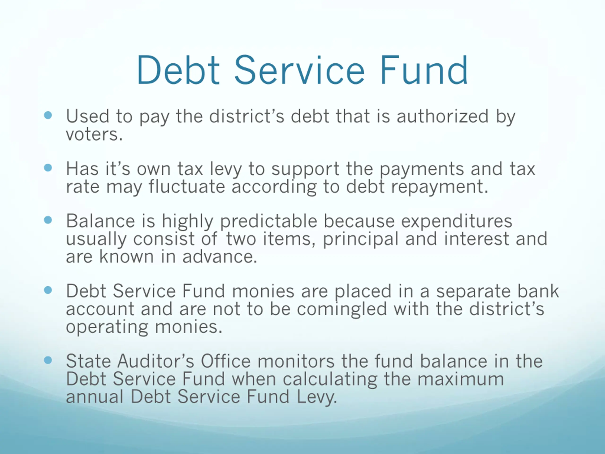 Debt Service Fund Used to pay the district s debt that is authorized by voters. Has it s own tax levy to support the payments and tax rate may fluctuate according to debt repayment. Balance is highly predictable because expenditures usually consist of two items, principal and interest and are known in advance. Debt Service Fund monies are placed in a separate bank account and are not to be comingled with the district s operating monies. State Auditor s Office monitors the fund balance in the Debt Service Fund when calculating the maximum annual Debt Service Fund Levy.