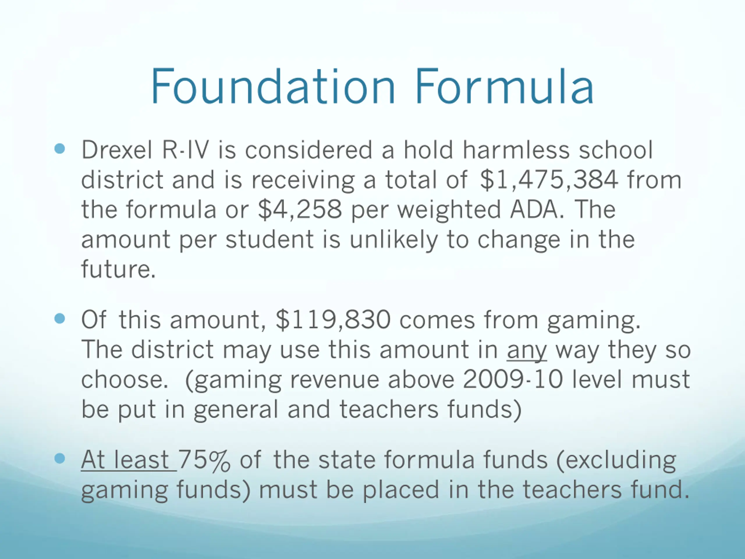 Foundation Formula Drexel R-IV is considered a hold harmless school district and is receiving a total of $1,475,384 from the formula or $4,258 per weighted ADA. The amount per student is unlikely to change in the future. Of this amount, $119,830 comes from gaming. The district may use this amount in any way they so choose. (gaming revenue above 2009-10 level must be put in general and teachers funds) At least 75% of the state formula funds (excluding gaming funds) must be placed in the teachers fund.