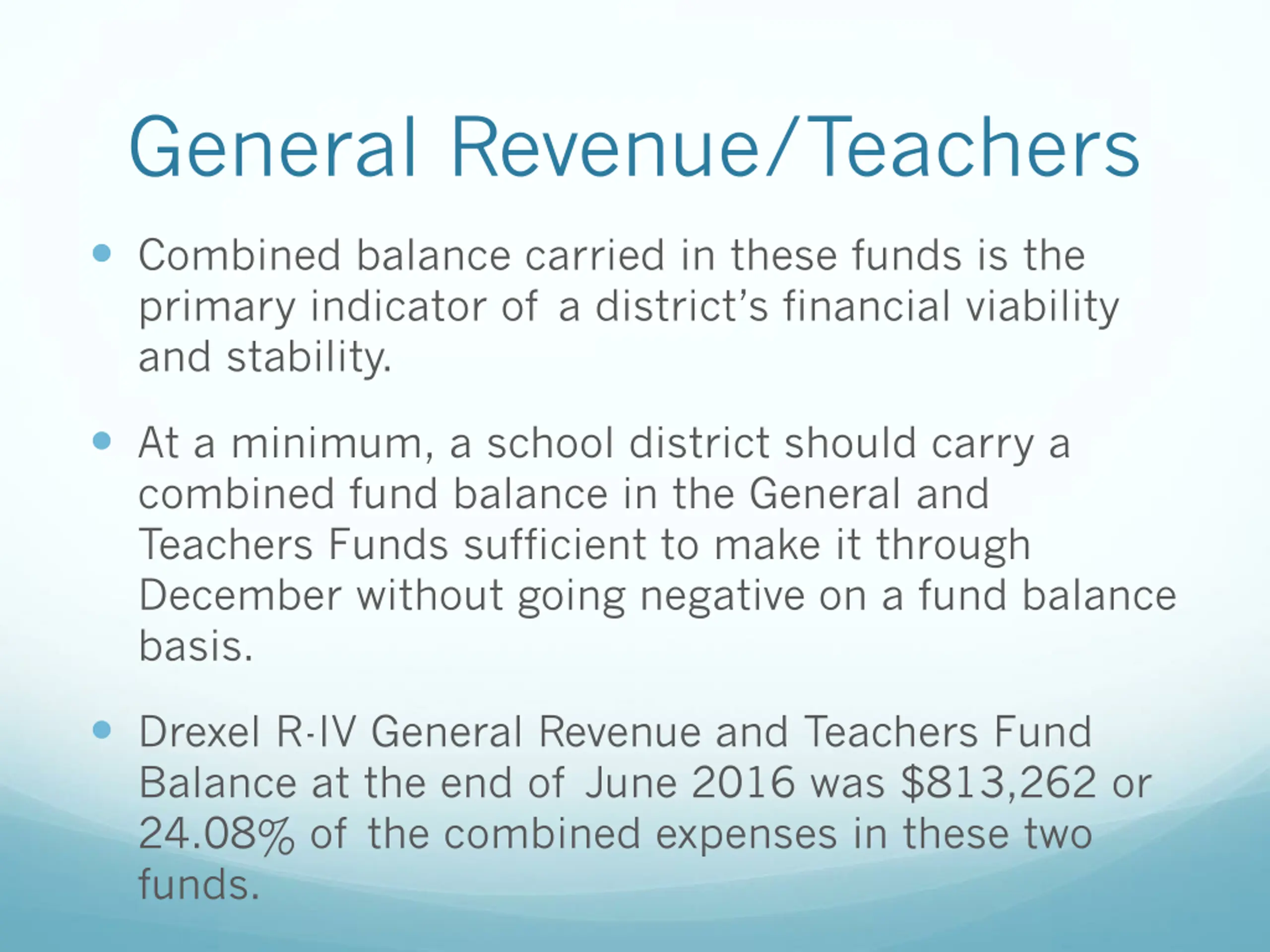 General Revenue/Teachers Combined balance carried in these funds is the primary indicator of a district s financial viability and stability. At a minimum, a school district should carry a combined fund balance in the General and Teachers Funds sufficient to make it through December without going negative on a fund balance basis. Drexel R-IV General Revenue and Teachers Fund Balance at the end of June 2016 was $813,262 or 24.08% of the combined expenses in these two funds.